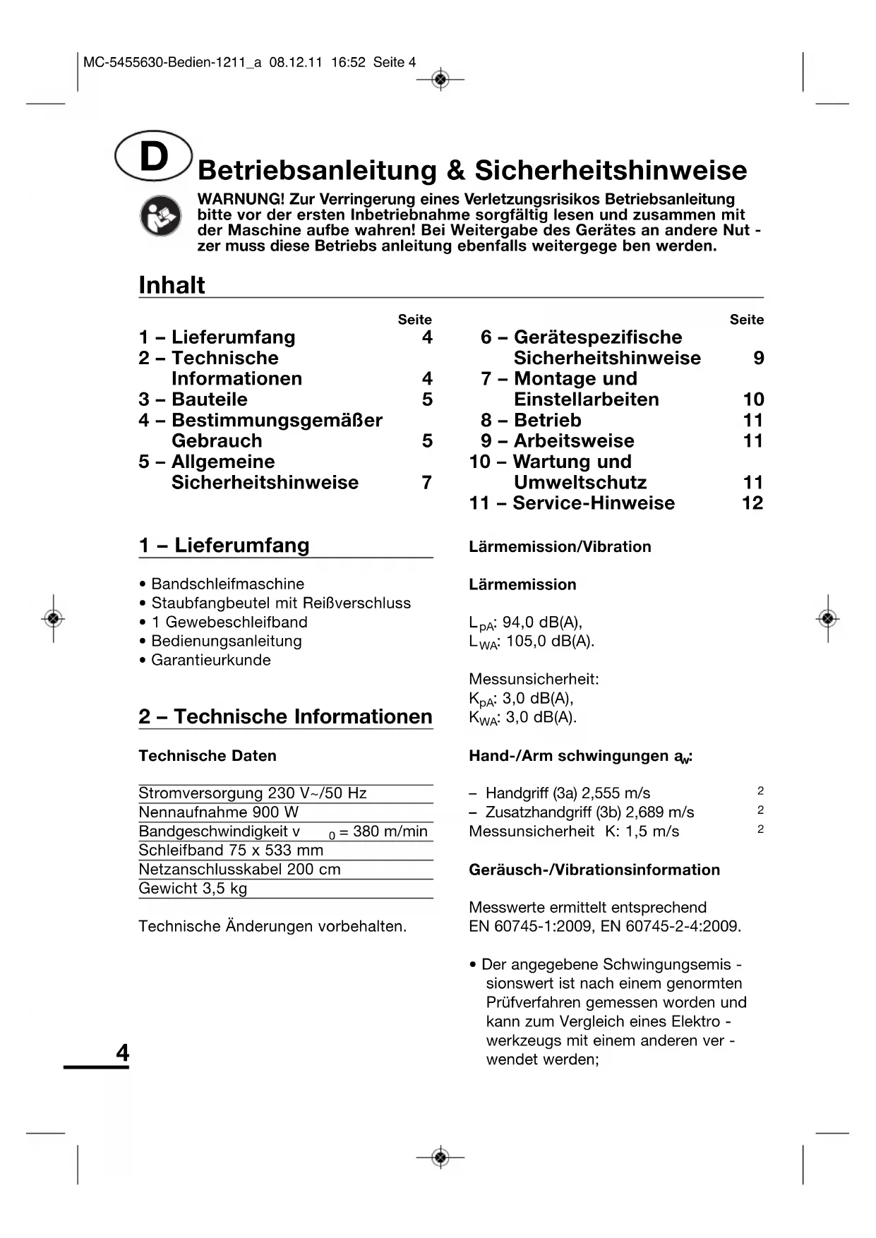 | 1 – Lieferumfang | 4 | 6 – Gerätespezifische Sicherheitshinweise | 9 |