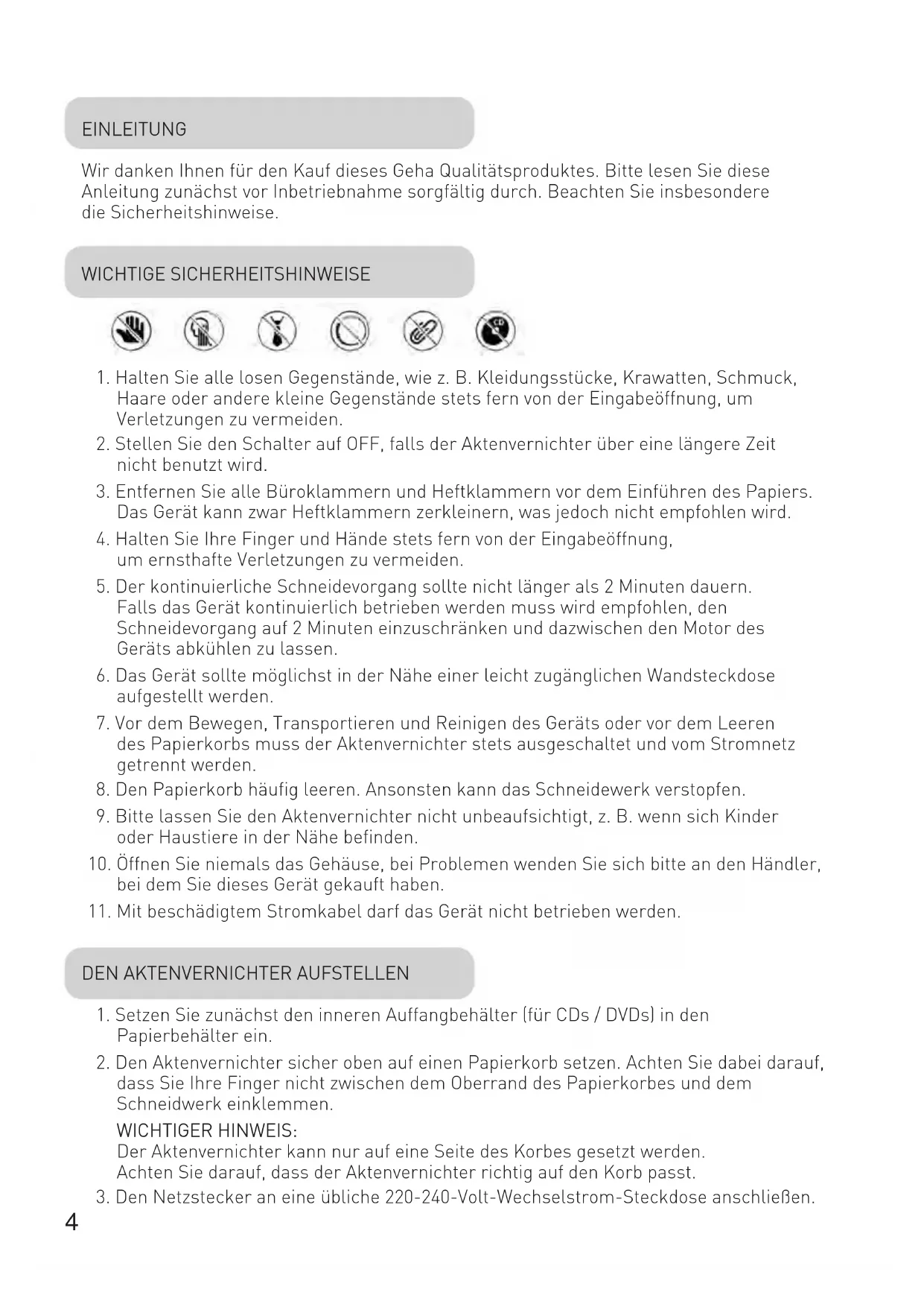 normalen Schneidevorgang nun fortsetzen. TECHNISCHE DATEN Modellbezeichnung: Shredder X7 CD Schnittart: Partikelschnitt Schnittgröße: 4 x 40 mm (Papier), 4 Teile (CD/DVD oder Kreditkarte) Schnittleistung: 7 Blatt DIN A4 (DIN A4, 70g/m²), 1 CD/DVD oder Kreditkarte Eingabebreite: 220 mm Eingabebreite für CDs/DVDs: 120 mm Eingangsspannung: 220-240VAC/50 Hz, 0,8 A Maße: 330 x 200 x 430 mm Papierkorb: 18L max. Dauerbetrieb: 2 min. ENTSORGUNG Das Symbol mit der durchgestrichenen Mülltonne weist darauf hin, dass elektrische Geräte nicht im normalen Hausmüll entsorgt werden dürfen. Bitte bringen Sie dieses Gerät zur umweltfreundlichen Entsorgung zu einem zugelassenen Wertstoffhof. GARANTIE Die Garantiezeit für Ihr Gerät beträgt 24 Monate. Bewahren Sie unbedingt den Kaufbeleg und die Originalverpackung auf. Bei einem Problem mit Ihrem Gerät wenden Sie sich bitte an Ihren Händler. Manual__X7CDComfort:Layout 1 07.09.10 16:43 Seite 67 INTRODUCTION Thank you for choosing this Geha quality product. Before using the device for the first time, carefully read this manual. Please pay special attention to the safety instructions. WICHTIGE SICHERHEITSHINWEISE