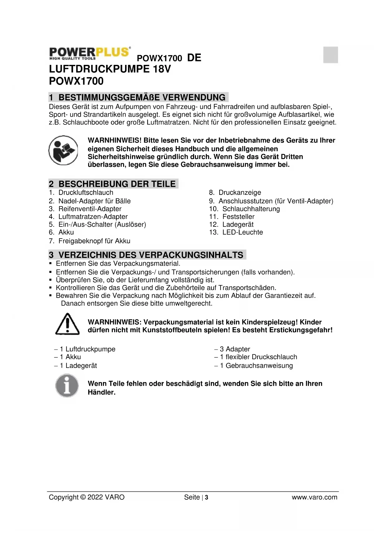 - Bewahren Sie die Verpackung nach Möglichkeit bis zum Ablauf der Garantiezeit auf. Danach entsorgen Sie diese bitte umweltgerecht. WARNHINWEIS: Verpackungsmaterial ist kein Kinderspielzeug! Kinder dürfen nicht mit Kunststoffbeuteln spielen! Es besteht Erstickungsgefahr! − 1 Luftdruckpumpe − 1 Akku − 1 Ladegerät − 3 Adapter − 1 flexibler Druckschlauch − 1 Gebrauchsanweisung Wenn Teile fehlen oder beschädigt sind, wenden Sie sich bitte an Ihren Händler.POWX1700 DE Copyright © 2022 VARO Seite | 4 www.varo.com