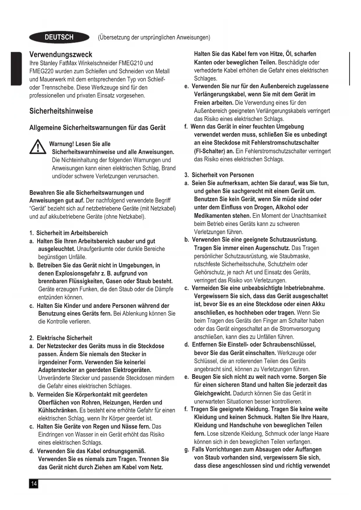 Garantie Stanley FatMax vertraut auf die Qualität der eigenen Geräte und bietet dem Käufer eine außergewöhnliche Garantie von 12 Monaten ab Kaufdatum. Diese Garantie versteht sich unbeschadet der gesetzlichen Gewährleistungsansprüche und schränkt diese keinesfalls ein. Diese Garantie gilt innerhalb der Staatsgebiete der Mitgliedstaaten der Europäischen Union und der Europäischen Freihandelszone. Zur Inanspruchnahme dieser Garantie muss sie den allgemeinen Geschäftsbedingungen von Stanley FatMax entsprechen und dem Verkäufer bzw. der Vertragswerkstatt ist ein Kaufnachweis vorzulegen. Die Bedingungen für die 1-jährige Garantie von Stanley FatMax und den Standort Ihrer nächstgelegenen Vertragswerkstatt nden Sie im Internet unter www.2helpU.com oder indem Sie sich an die lokale Stanley FatMax-Niederlassung wenden, deren Adresse Sie in dieser Anleitung nden. Ihr neues Stanley FatMax-Produkt können Sie auf unserer Website unter www.blackanddecker.de registrieren. Dort erhalten Sie auch Informationen über neue Produkte und Sonderangebote. Utilisation prévue Vos meuleuses d’angle Stanley Fat Max FMEG210 et FMEG220 ont été conçues pour le meulage et le tronçonnage du métal et des matériaux de maçonnerie à l’aide de disques à tronçonner et à meuler adaptés. Équipés de carters de protection appropriés, ces outils sont prévus pour un usage grand public et professionnel. Consignes de sécurité Avertissements de sécurité générale liés aux outils électriques