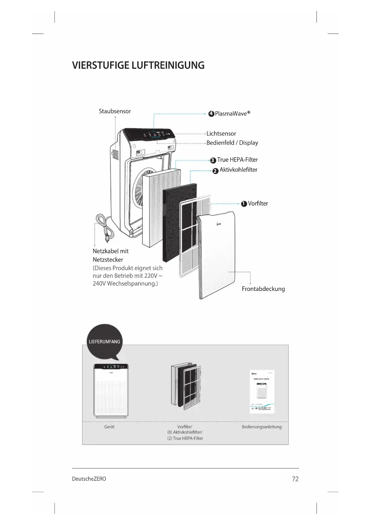 Lichtsensor Frontabdeckung Netzkabel mit Netzstecker Aktivkohlelter Vorlter PlasmaWave Bedienfeld / Display True HEPA-Filter Staubsensor (Dieses Produkt eignet sich nur den Betrieb mit 220V ~ 240V Wechselspannung.) GerätBedienungsanleitungVorlte/(8) Aktivkohlelter/(2) True HEPA-FilterLIEFERUMFANG73 Deutsche ZERO BEDIENELEMENTE Luftauslassönung 소피아 1 소피아 2 영문소피아 1 Timer-Anzeige Mode-Taste Schaltet das Gerät ein oder aus. Taste Lüftergeschwindigkeit Timer-Taste Filterwechselanzeige Drücken Sie diese Taste, um die einstellbaren Werte zu durchlaufen und die gewünschte Betriebsart (Auto, Sleep) einzustellen. Gibt an, ob PlasmaWave aktiviert oder deaktiviert ist. PlasmaWave -Anzeige Lüftergeschwindigkeitsanzeige Zeigt die aktuelle Lüfterdrehzahl an. Wenn der Timer eingestellt wurde, zeigt die LED-Lampe die eingestellte Betriebszeit an. Reset-Taste Halten Sie die Reset-Taste nach dem Filterwechsel mindestens 5 Sekunden lang gedrückt. Luftqualitätsanzeige Farbkodierte LED zur Anzeige von drei Luftqualitätsstufen. Power-Taste Ermöglicht die manuelle Bedienung des Geräts. Drücken Sie diese Taste, um die einstellbaren Werte zu durchlaufen (Low, Medium, High, Turbo). PlasmaWave -Taste Aktiviert oder deaktiviert PlasmaWave . Drücken Sie diese Taste, um die einstellbaren Werte zu durchlaufen und die gewünschte Betriebsdauer einzustellen (1 h, 4 h, 8 h, [NO TIMER]) LED-Lampe, die aueuchtet, wenn es Zeit ist, den Filter zu wechseln. Lichtsensor Erfasst die Lichtstärke in der Umgebung, um die Helligkeit der LED-Anzeigen entsprechend anzupassen.74 Deutsche ZERO AUFSTELLUNGSORT Achten Sie darauf, dass der Luftreiniger 30 bis 45 cm Abstand zu Fernsehgeräten, Rundfunkgeräten und anderen elektronischen Geräte hat Elektromagnetische Störungen von bestimmten Elektronikelementen können sonst Fehlfunktionen verursachen. Stellen Sie das Gerät in Innenräumen geschützt vor direktem Sonnenlicht auf Direkte Sonneneinstrahlung kann Fehlfunktion oder einen Ausfall des Produkts zur Folge haben. Stellen Sie das Gerät auf einem harten und ebenen Untergrund auf Instabile oder geneigte Flächen können zu ungewöhnlichen Geräuschen und Vibrationen führen. 30~45 cm 10 cm WARNHINWEIS Befolgen Sie diese Anweisungen, um das Risiko von schweren oder tödlichen Verletzungen und die Gefahr einer Beschädigung des Geräts zu verringern. Verwenden Sie das Gerät nicht in der Nähe von Nebeln oder Dämpfen von industriellem Öl oder größeren Mengen an metallischen Staub.Stellen Sie das Gerät nicht in der Nähe von Heizelementen auf.Installieren Sie das Gerät nicht in irgendeiner Art von Motor- oder Transportfahrzeug (LKW, Boote, Schiffe usw.).Stellen Sie das Gerät nicht in einem Bereich mit übermäßigen Mengen an giftigen Gasen auf.Stellen Sie das Gerät nicht in der Nähe von brennbaren Materialien (Aerosole, Brennstoffe, Gase usw.) auf.Achten Sie darauf, dass das Gerät nicht in den Wind oder in Zugluft gerichtet ist.Stellen Sie das Gerät nicht unterhalb einer elektrischen Steckdose auf.Stellen Sie das Gerät nicht in übermäßig feuchten Bereichen auf, wo es nass werden könnte.
