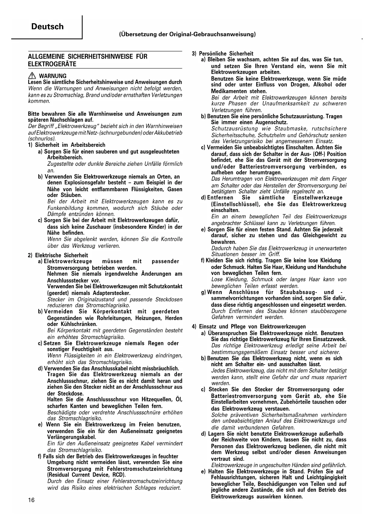 ELEKTROGERÄTE WARNUNG Lesen Sie sämtliche Sicherheitshinweise und Anweisungen durch Wenn die Warnungen und Anweisungen nicht befolgt werden, kann es zu Stromschlag, Brand und/oder ernsthaften Verletzungen kommen. Bitte bewahren Sie alle Warnhinweise und Anweisungen zum späteren Nachschlagen auf. Der Begriff „Elektrowerkzeug“ bezieht sich in den Warnhinweisen auf Elektrowerkzeuge mit Netz- (schnurgebunden) oder Akkubetrieb (schnurlos).