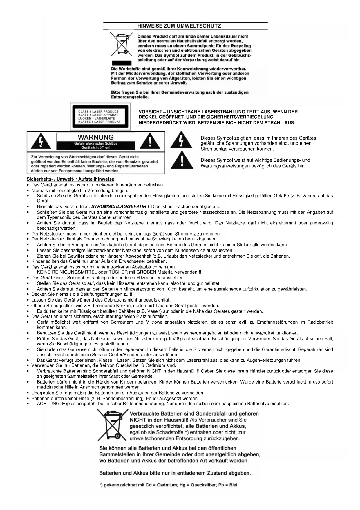 Das Gerat verfugt uber einen Klasse 1 Laser. Setzen Sie sich nicht dem Laserstrahl aus, dies kann zu Augenverletzungen führen. - Verwenden Sie nur Batterien, die frei von Quecksilber & Cadmium sind.