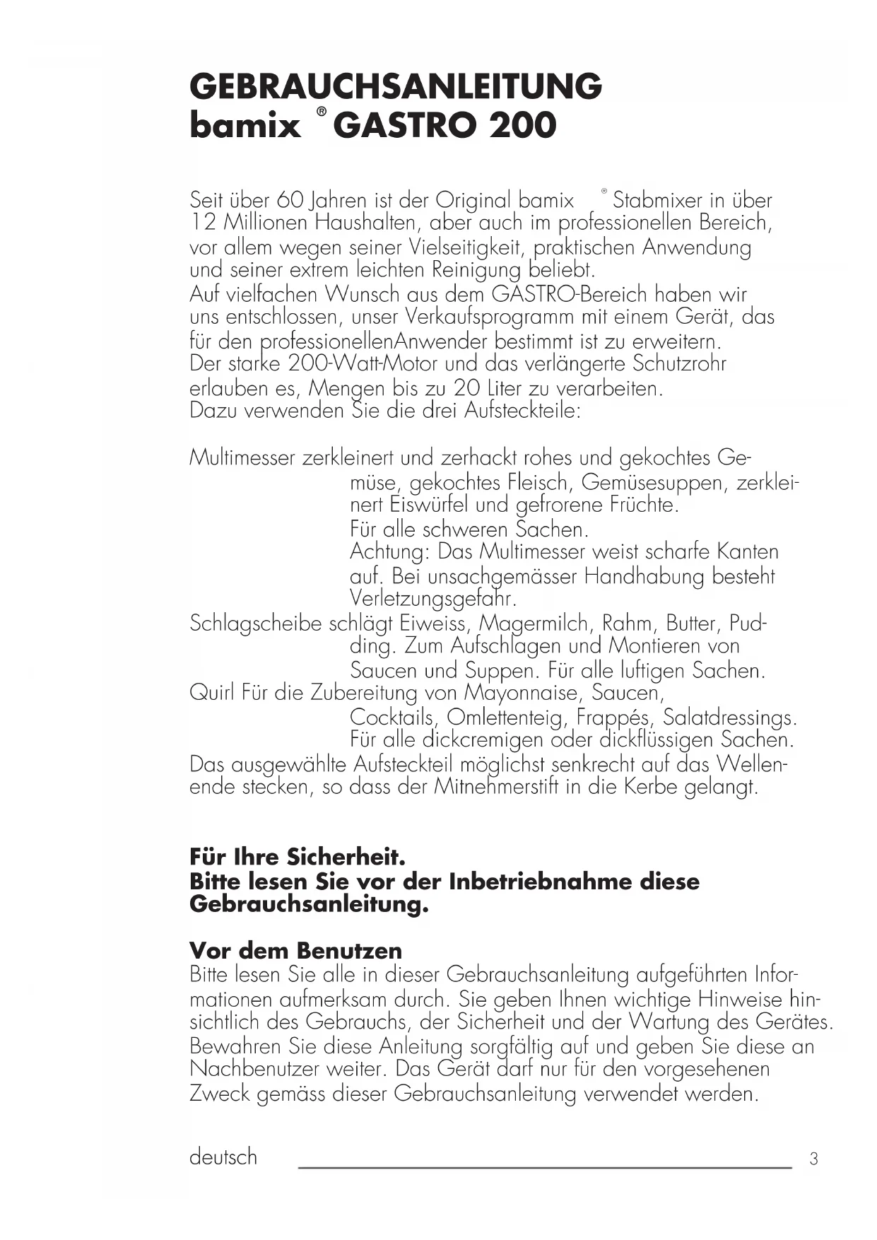 Stabmixer in über 12 Millionen Haushalten, aber auch im professionellen Bereich, vor allem wegen seiner Vielseitigkeit, praktischen Anwendung und seiner extrem leichten Reinigung beliebt. Auf vielfachen Wunsch aus dem GASTRO-Bereich haben wir uns entschlossen, unser Verkaufsprogramm mit einem Gerät, das für den professionellen Anwender bestimmt ist zu erweitern. Der starke 200-Watt-Motor und das verlängerte Schutzrohr erlauben es, Mengen bis zu 20 Liter zu verarbeiten. Dazu verwenden Sie die drei Aufsteckteile: Multimesser zerkleinert und zerhackt rohes und gekochtes Ge- müse, gekochtes Fleisch, Gemüsesuppen, zerklei- nert Eiswürfel und gefrorene Früchte. Für alle schweren Sachen. Achtung: Das Multimesser weist scharfe Kanten auf. Bei unsachgemässer Handhabung besteht Verletzungsgefahr. Schlagscheibe schlägt Eiweiss, Magermilch, Rahm, Butter, Pud- ding. Zum Aufschlagen und Montieren von Saucen und Suppen. Für alle luftigen Sachen. Quirl Für die Zubereitung von Mayonnaise, Saucen, Cocktails, Omlettenteig, Frappés, Salatdressings. Für alle dickcremigen oder dickflüssigen Sachen. Das ausgewählte Aufsteckteil möglichst senkrecht auf das Wellen- ende stecken, so dass der Mitnehmerstift in die Kerbe gelangt. Für Ihre Sicherheit. Bitte lesen Sie vor der Inbetriebnahme diese Gebrauchsanleitung. Vor dem Benutzen Bitte lesen Sie alle in dieser Gebrauchsanleitung aufgeführten Infor- mationen aufmerksam durch. Sie geben Ihnen wichtige Hinweise hin- sichtlich des Gebrauchs, der Sicherheit und der Wartung des Gerätes. Bewahren Sie diese Anleitung sorgfältig auf und geben Sie diese an Nachbenutzer weiter. Das Gerät darf nur für den vorgesehenen Zweck gemäss dieser Gebrauchsanleitung verwendet werden. deutsch4 deutsch Beachten Sie die Sicherheitshinweise Sicherheitsvorschriften für bamix