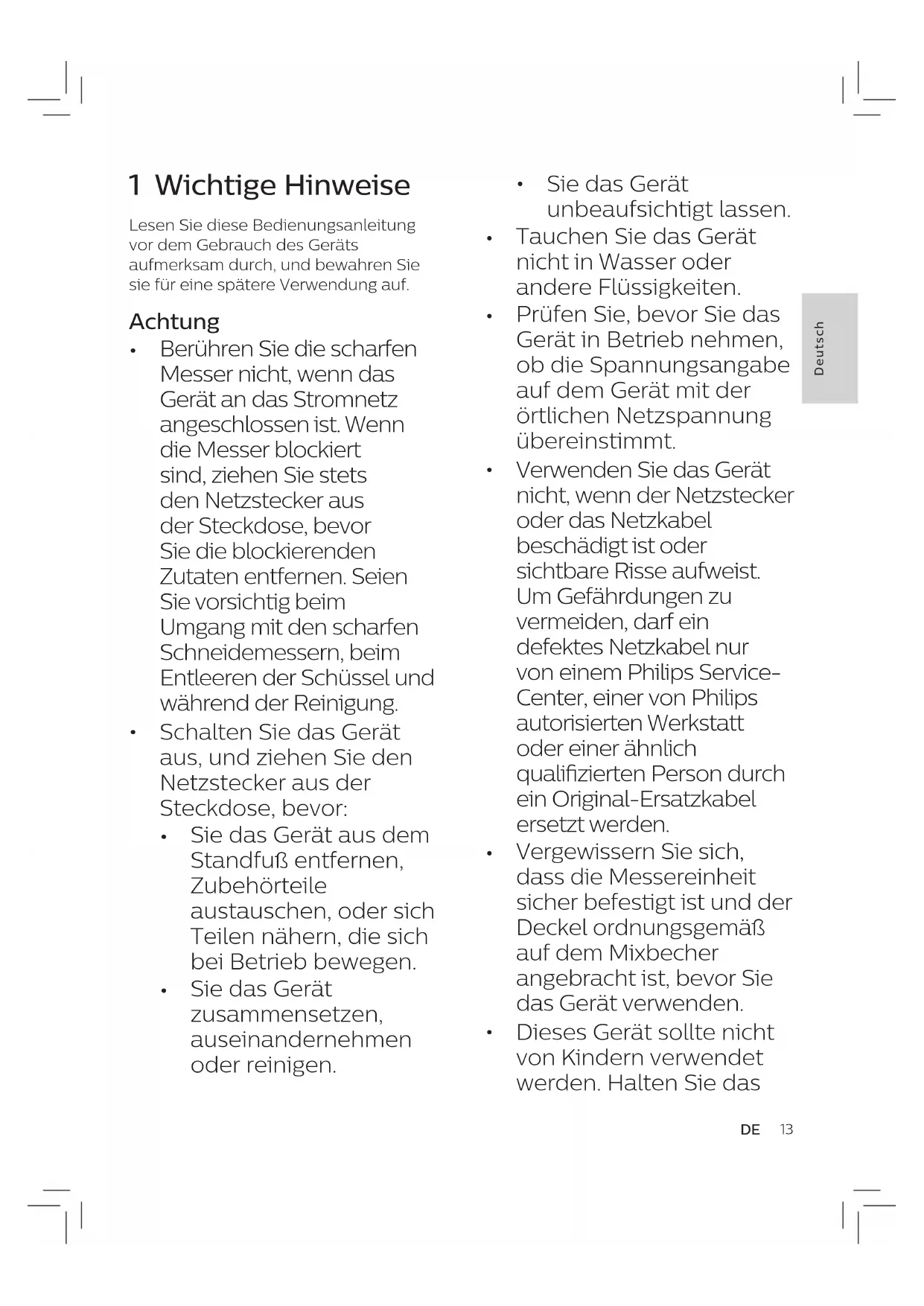 Verwenden Sie das Gerät nicht, wenn der Netzstecker oder das Netzkabel beschädigt ist oder sichtbare Risse aufweist. Um Gefährdungen zu vermeiden, darf ein defektes Netzkabel nur von einem Philips Service- Center, einer von Philips autorisierten Werkstatt oder einer ähnlich qualizierten Person durch ein Original-Ersatzkabel ersetzt werden.