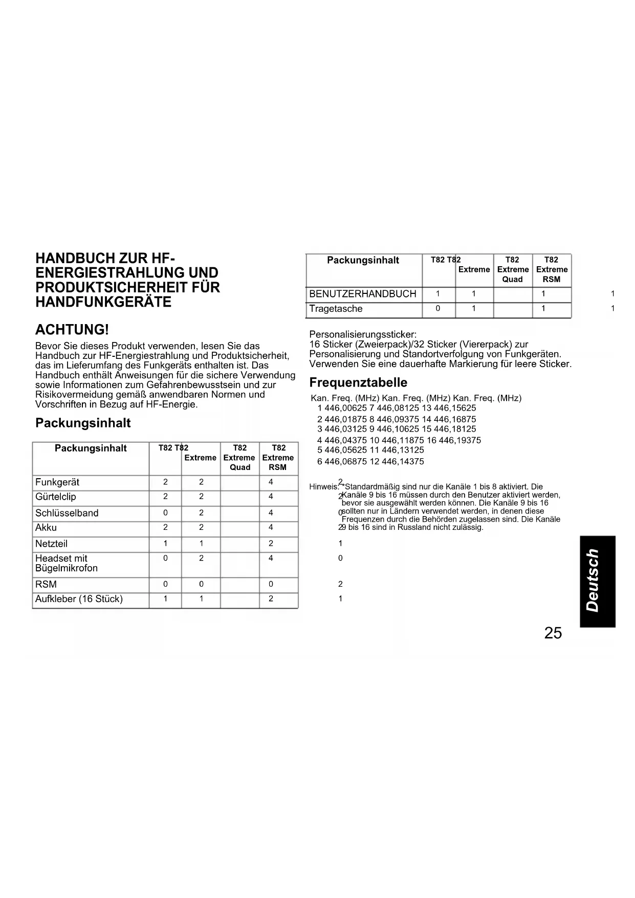 HANDFUNKGERÄTE ACHTUNG! Bevor Sie dieses Produkt verwenden, lesen Sie das Handbuch zur HF-Energiestrahlung und Produktsicherheit, das im Lieferumfang des Funkgeräts enthalten ist. Das Handbuch enthält Anweisungen für die sichere Verwendung sowie Informationen zum Gefahrenbewusstsein und zur Risikovermeidung gemäß anwendbaren Normen und Vorschriften in Bezug auf HF-Energie. Packungsinhalt Personalisierungssticker: 16 Sticker (Zweierpack)/32 Sticker (Viererpack) zur Personalisierung und Standortverfolgung von Funkgeräten. Verwenden Sie eine dauerhafte Markierung für leere Sticker. Frequenztabelle Hinweis: *Standardmäßig sind nur die Kanäle 1 bis 8 aktiviert. Die Kanäle 9 bis 16 müssen durch den Benutzer aktiviert werden, bevor sie ausgewählt werden können. Die Kanäle 9 bis 16 sollten nur in Ländern verwendet werden, in denen diese Frequenzen durch die Behörden zugelassen sind. Die Kanäle 9 bis 16 sind in Russland nicht zulässig. Packungsinhalt T82 T82 Extreme T82 Extreme Quad T82 Extreme RSM Funkgerät Gürtelclip Schlüsselband Akku Netzteil Headset mit Bügelmikrofon RSM Aufkleber (16 Stück) BENUTZERHANDBUCH Tragetasche 01 1 1Kan. Freq. (MHz) Kan. Freq. (MHz) Kan. Freq. (MHz)1 446,00625 7 446,08125 13 446,156252 446,01875 8 446,09375 14 446,168753 446,03125 9 446,10625 15 446,181254 446,04375 10 446,11875 16 446,193755 446,05625 11 446,131256 446,06875 12 446,14375 Packungsinhalt T82 T82 Extreme T82 Extreme Quad T82 Extreme RSM MN003428A01.book Page 25 Tuesday, April 21, 2020 4:48 PM26 Deutsch Funktionen und technische Daten