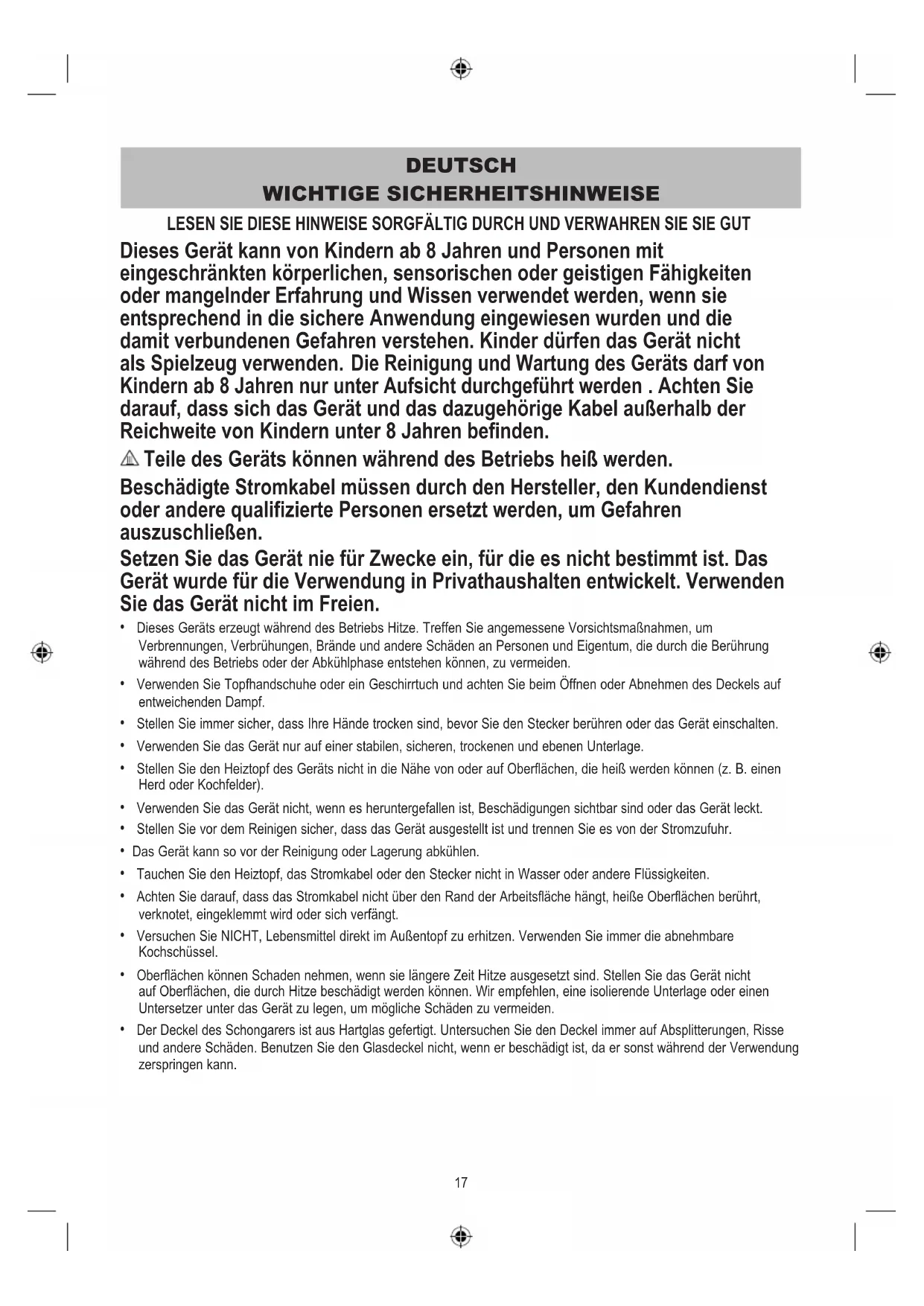- Tauchen Sie den Heiztopf, das Stromkabel oder den Stecker nicht in Wasser oder andere Flüssigkeiten.