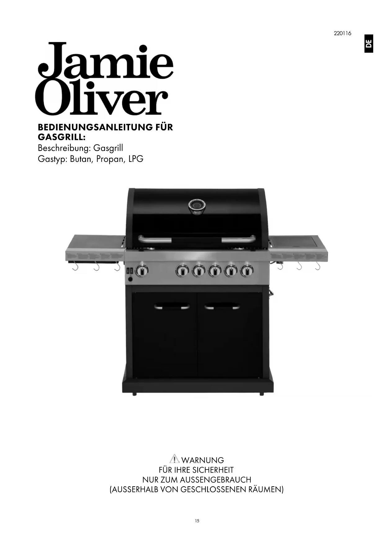 (AUSSERHALB VON GESCHLOSSENEN RÄUMEN) DE16 Bitte lesen Sie diese Bedienungsanleitung sorgfältig durch und stellen Sie sicher, dass der Grill sachgerecht und gemäß dieser Anleitung montiert, aufgebaut und gewartet wird. Die Nichtbeachtung dieser Anleitung kann zu schweren Personen- und/oder Sachschäden führen. Bei Fragen über den Aufbau oder Betrieb dieses Grills wenden Sie sich bitte an Ihren Händler, Lieferanten, den Hersteller oder Vertreter, oder suchen Sie Unterstützung auf jamieoliverbbq.com. TECHNISCHE INFORMATIONEN MODELL-NR.: PRO 4 DELUXE (4 Brenner + Seitenbrenner + Rückbrenner) BESCHREIBUNG: VIERBRENNERGASGRILL MIT SEITEN UND RÜCKBRENNER GESAMTWÄRMELEISTUNG: (ALLE GASKATEGORIEN)