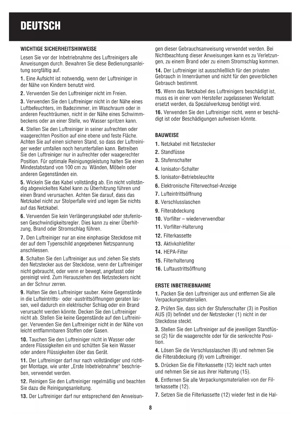 WICHTIGE SICHERHEITSHINWEISE Lesen Sie vor der Inbetriebnahme des Luftreinigers alle Anweisungen durch. Bewahren Sie diese Bedienungsanlei- tung sorgfältig auf.