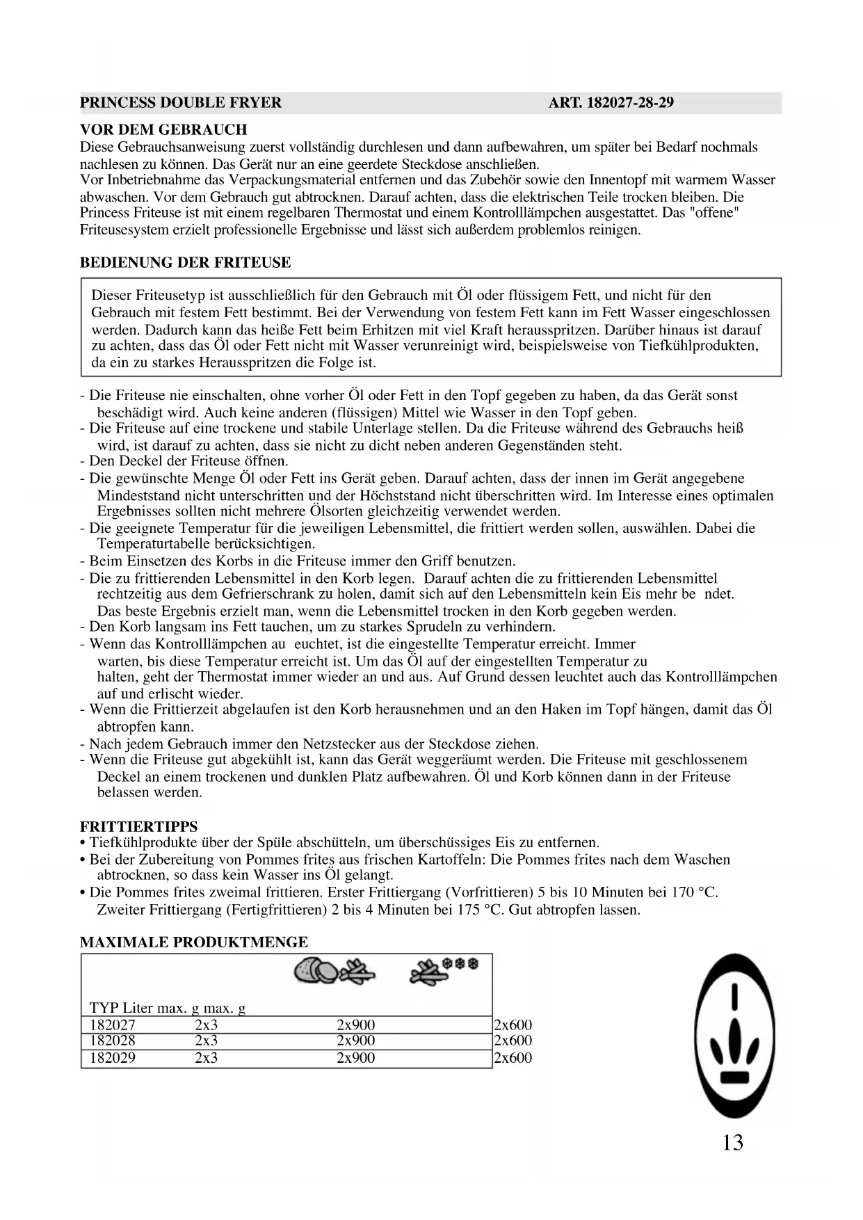 Double 182027 - Fritteuse PRINCESS - Kostenlose Bedienungsanleitung