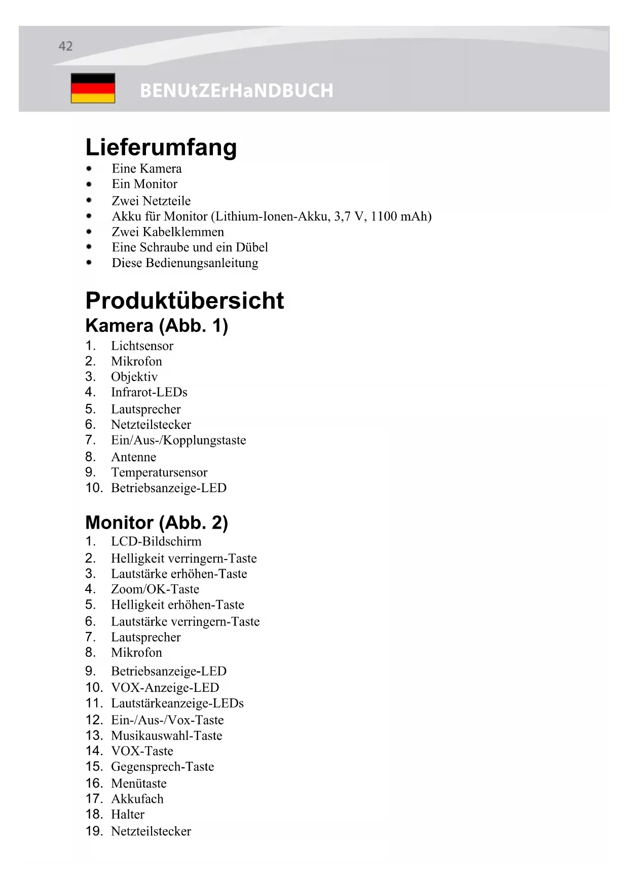 außerhalb der Reichweite des Babys befinden (mindestens 1 Meter entfernt). Hinweis: Dies ist auch dann zu beachten, wenn Ihr Baby noch nicht stehen oder sich bewegen kann. Ÿ Verwenden Sie zur V ermeidung von Strangulierungsgefahr einen kabellosen Babymonitor. Ÿ Verwenden Sie niemals Verlängerungskabel in V erbindung mit Netzteilen. Verwenden Sie nur die mitgelieferten Netzteile. 1 MeterNetzteilkabel Babyeinheit1 Meter49 LUVION Premium Baby products de50 UŽiVatELSKÁ PŘÍrUČKa rOZSah DODÁVKy: