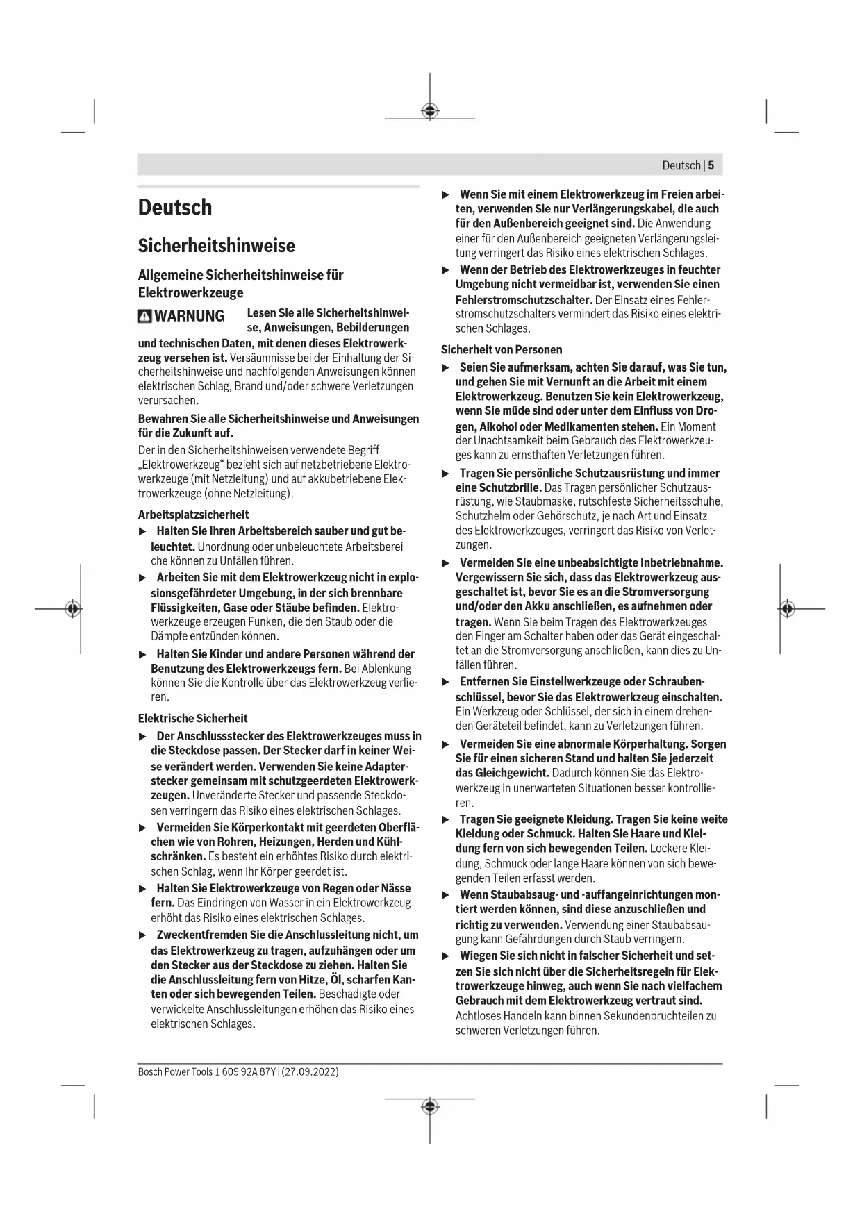 (5) (6) 1 609 92A 87Y | (27.09.2022) Bosch Power ToolsDeutsch | 5 Deutsch Sicherheitshinweise Allgemeine Sicherheitshinweise für Elektrowerkzeuge WARNUNG Lesen Sie alle Sicherheitshinwei- se, Anweisungen, Bebilderungen und technischen Daten, mit denen dieses Elektrowerk- zeug versehen ist. Versäumnisse bei der Einhaltung der Si- cherheitshinweise und nachfolgenden Anweisungen können elektrischen Schlag, Brand und/oder schwere Verletzungen verursachen. Bewahren Sie alle Sicherheitshinweise und Anweisungen für die Zukunft auf. Der in den Sicherheitshinweisen verwendete Begriff „Elektrowerkzeug“ bezieht sich auf netzbetriebene Elektro- werkzeuge (mit Netzleitung) und auf akkubetriebene Elek- trowerkzeuge (ohne Netzleitung). Arbeitsplatzsicherheit u Halten Sie Ihren Arbeitsbereich sauber und gut be- leuchtet. Unordnung oder unbeleuchtete Arbeitsberei- che können zu Unfällen führen. u Arbeiten Sie mit dem Elektrowerkzeug nicht in explo- sionsgefährdeter Umgebung, in der sich brennbare Flüssigkeiten, Gase oder Stäube befinden. Elektro- werkzeuge erzeugen Funken, die den Staub oder die Dämpfe entzünden können. u Halten Sie Kinder und andere Personen während der Benutzung des Elektrowerkzeugs fern. Bei Ablenkung können Sie die Kontrolle über das Elektrowerkzeug verlie- ren. Elektrische Sicherheit u Der Anschlussstecker des Elektrowerkzeuges muss in die Steckdose passen. Der Stecker darf in keiner Wei- se verändert werden. Verwenden Sie keine Adapter- stecker gemeinsam mit schutzgeerdeten Elektrowerk- zeugen. Unveränderte Stecker und passende Steckdo- sen verringern das Risiko eines elektrischen Schlages. u Vermeiden Sie Körperkontakt mit geerdeten Oberflä- chen wie von Rohren, Heizungen, Herden und Kühl- schränken. Es besteht ein erhöhtes Risiko durch elektri- schen Schlag, wenn Ihr Körper geerdet ist. u Halten Sie Elektrowerkzeuge von Regen oder Nässe fern. Das Eindringen von Wasser in ein Elektrowerkzeug erhöht das Risiko eines elektrischen Schlages. u Zweckentfremden Sie die Anschlussleitung nicht, um das Elektrowerkzeug zu tragen, aufzuhängen oder um den Stecker aus der Steckdose zu ziehen. Halten Sie die Anschlussleitung fern von Hitze, Öl, scharfen Kan- ten oder sich bewegenden Teilen. Beschädigte oder verwickelte Anschlussleitungen erhöhen das Risiko eines elektrischen Schlages. u Wenn Sie mit einem Elektrowerkzeug im Freien arbei- ten, verwenden Sie nur Verlängerungskabel, die auch für den Außenbereich geeignet sind. Die Anwendung einer für den Außenbereich geeigneten Verlängerungslei- tung verringert das Risiko eines elektrischen Schlages. u Wenn der Betrieb des Elektrowerkzeuges in feuchter Umgebung nicht vermeidbar ist, verwenden Sie einen Fehlerstromschutzschalter. Der Einsatz eines Fehler- stromschutzschalters vermindert das Risiko eines elektri- schen Schlages. Sicherheit von Personen u Seien Sie aufmerksam, achten Sie darauf, was Sie tun, und gehen Sie mit Vernunft an die Arbeit mit einem Elektrowerkzeug. Benutzen Sie kein Elektrowerkzeug, wenn Sie müde sind oder unter dem Einfluss von Dro- gen, Alkohol oder Medikamenten stehen. Ein Moment der Unachtsamkeit beim Gebrauch des Elektrowerkzeu- ges kann zu ernsthaften Verletzungen führen. u Tragen Sie persönliche Schutzausrüstung und immer eine Schutzbrille. Das Tragen persönlicher Schutzaus- rüstung, wie Staubmaske, rutschfeste Sicherheitsschuhe, Schutzhelm oder Gehörschutz, je nach Art und Einsatz des Elektrowerkzeuges, verringert das Risiko von Verlet- zungen. u Vermeiden Sie eine unbeabsichtigte Inbetriebnahme. Vergewissern Sie sich, dass das Elektrowerkzeug aus- geschaltet ist, bevor Sie es an die Stromversorgung und/oder den Akku anschließen, es aufnehmen oder tragen. Wenn Sie beim Tragen des Elektrowerkzeuges den Finger am Schalter haben oder das Gerät eingeschal- tet an die Stromversorgung anschließen, kann dies zu Un- fällen führen. u Entfernen Sie Einstellwerkzeuge oder Schrauben- schlüssel, bevor Sie das Elektrowerkzeug einschalten. Ein Werkzeug oder Schlüssel, der sich in einem drehen- den Geräteteil befindet, kann zu Verletzungen führen. u Vermeiden Sie eine abnormale Körperhaltung. Sorgen Sie für einen sicheren Stand und halten Sie jederzeit das Gleichgewicht. Dadurch können Sie das Elektro- werkzeug in unerwarteten Situationen besser kontrollie- ren. u Tragen Sie geeignete Kleidung. Tragen Sie keine weite Kleidung oder Schmuck. Halten Sie Haare und Klei- dung fern von sich bewegenden Teilen. Lockere Klei- dung, Schmuck oder lange Haare können von sich bewe- genden Teilen erfasst werden. u Wenn Staubabsaug- und -auffangeinrichtungen mon- tiert werden können, sind diese anzuschließen und richtig zu verwenden. Verwendung einer Staubabsau- gung kann Gefährdungen durch Staub verringern. u Wiegen Sie sich nicht in falscher Sicherheit und set- zen Sie sich nicht über die Sicherheitsregeln für Elek- trowerkzeuge hinweg, auch wenn Sie nach vielfachem Gebrauch mit dem Elektrowerkzeug vertraut sind. Achtloses Handeln kann binnen Sekundenbruchteilen zu schweren Verletzungen führen. Bosch Power Tools 1 609 92A 87Y | (27.09.2022)6 | Deutsch Verwendung und Behandlung des Elektrowerkzeugs u Überlasten Sie das Elektrowerkzeug nicht. Verwenden Sie für Ihre Arbeit das dafür bestimmte Elektrowerk- zeug. Mit dem passenden Elektrowerkzeug arbeiten Sie besser und sicherer im angegebenen Leistungsbereich. u Benutzen Sie kein Elektrowerkzeug, dessen Schalter defekt ist. Ein Elektrowerkzeug, das sich nicht mehr ein- oder ausschalten lässt, ist gefährlich und muss repariert werden. u Ziehen Sie den Stecker aus der Steckdose und/oder entfernen Sie einen abnehmbaren Akku, bevor Sie Ge- räteeinstellungen vornehmen, Einsatzwerkzeugteile wechseln oder das Elektrowerkzeug weglegen. Diese Vorsichtsmaßnahme verhindert den unbeabsichtigten Start des Elektrowerkzeuges. u Bewahren Sie unbenutzte Elektrowerkzeuge außer- halb der Reichweite von Kindern auf. Lassen Sie keine Personen das