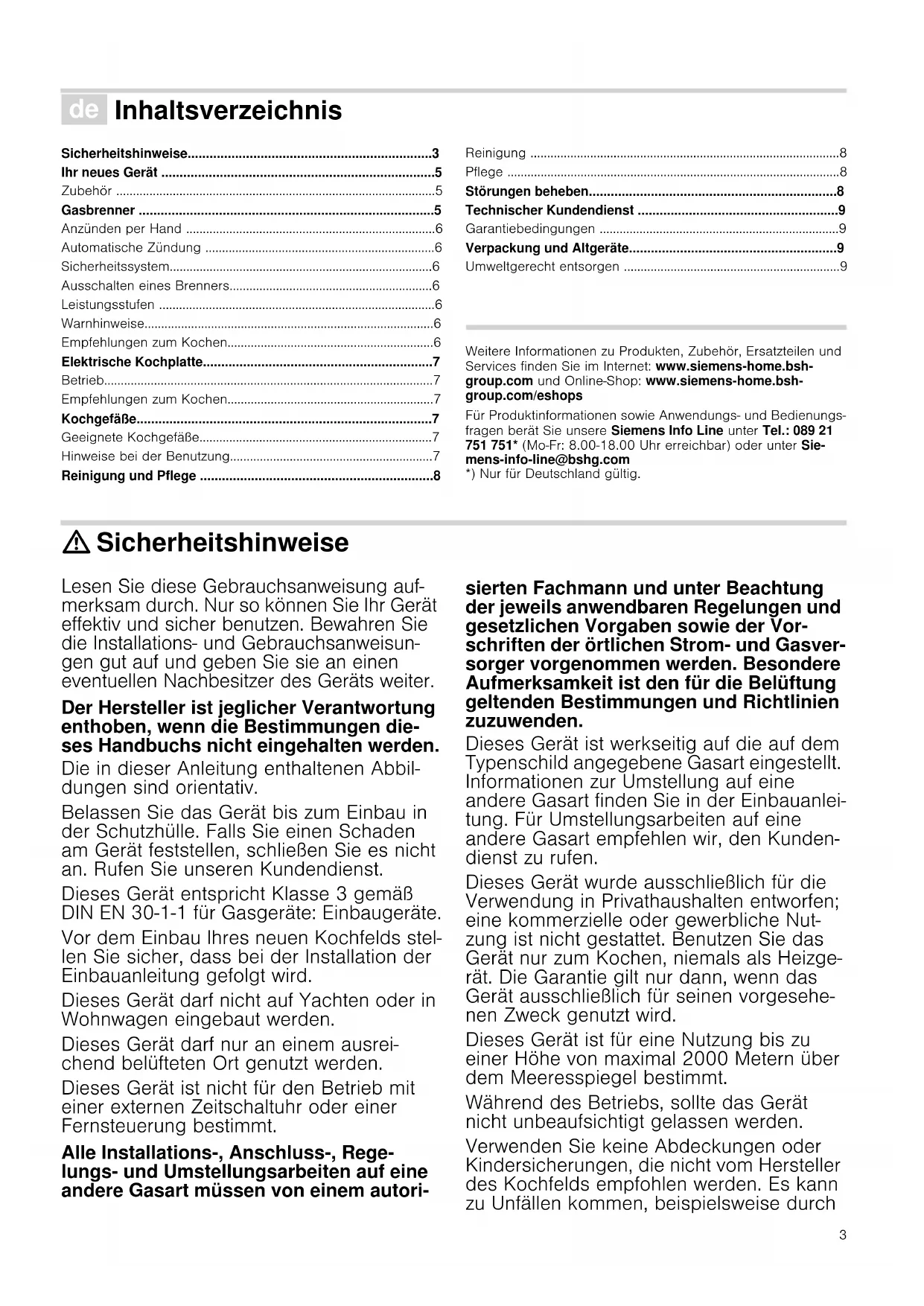 - Umweltgerecht entsorgen Produktinfo Weitere Informationen zu Produkten, Zubehör, Ersatzteilen und Services finden Sie im Internet: www.siemens-home.bsh- group.com und Online-Shop: www.siemens-home.bsh- group.com/eshops Für Produktinformationen sowie Anwendungs- und Bedienungs- fragen berät Sie unsere Siemens Info Line unter Tel.: 089 21 751 751* (Mo-Fr: 8.00-18.00 Uhr erreichbar) oder unter Sie- mens-info-line@bshg.com *) Nur für Deutschland gültig. : Sicherheitshinweise Lesen Sie diese Gebrauchsanweisung auf- merksam durch. Nur so können Sie Ihr Gerät effektiv und sicher benutzen. Bewahren Sie die Installations- und Gebrauchsanweisun- gen gut auf und geben Sie sie an einen eventuellen Nachbesitzer des Geräts weiter. Der Hersteller ist jeglicher Verantwortung enthoben, wenn die Bestimmungen die- ses Handbuchs nicht eingehalten werden. Die in dieser Anleitung enthaltenen Abbil- dungen sind orientativ. Belassen Sie das Gerät bis zum Einbau in der Schutzhülle. Falls Sie einen Schaden am Gerät feststellen, schließen Sie es nicht an. Rufen Sie unseren Kundendienst. Dieses Gerät entspricht Klasse 3 gemäß DIN EN 30-1-1 für Gasgeräte: Einbaugeräte. Vor dem Einbau Ihres neuen Kochfelds stel- len Sie sicher, dass bei der Installation der Einbauanleitung gefolgt wird. Dieses Gerät darf nicht auf Yachten oder in Wohnwagen eingebaut werden. Dieses Gerät darf nur an einem ausrei- chend belüfteten Ort genutzt werden. Dieses Gerät ist nicht für den Betrieb mit einer externen Zeitschaltuhr oder einer Fernsteuerung bestimmt. Alle Installations-, Anschluss-, Rege- lungs- und Umstellungsarbeiten auf eine andere Gasart müssen von einem autori- sierten Fachmann und unter Beachtung der jeweils anwendbaren Regelungen und gesetzlichen Vorgaben sowie der Vor- schriften der örtlichen Strom- und Gasver- sorger vorgenommen werden. Besondere Aufmerksamkeit ist den für die Belüftung geltenden Bestimmungen und Richtlinien zuzuwenden. Dieses Gerät ist werkseitig auf die auf dem Typenschild angegebene Gasart eingestellt. Informationen zur Umstellung auf eine andere Gasart finden Sie in der Einbauanlei- tung. Für Umstellungsarbeiten auf eine andere Gasart empfehlen wir, den Kunden- dienst zu rufen. Dieses Gerät wurde ausschließlich für die Verwendung in Privathaushalten entworfen; eine kommerzielle oder gewerbliche Nut- zung ist nicht gestattet. Benutzen Sie das Gerät nur zum Kochen, niemals als Heizge- rät. Die Garantie gilt nur dann, wenn das Gerät ausschließlich für seinen vorgesehe- nen Zweck genutzt wird. Dieses Gerät ist für eine Nutzung bis zu einer Höhe von maximal 2000 Metern über dem Meeresspiegel bestimmt. Während des Betriebs, sollte das Gerät nicht unbeaufsichtigt gelassen werden. Verwenden Sie keine Abdeckungen oder Kindersicherungen, die nicht vom Hersteller des Kochfelds empfohlen werden. Es kann zu Unfällen kommen, beispielsweise durch4 Überhitzung, Entflammung oder Ablösung von Materialteilen. Dieses Gerät kann von Kindern ab 8 Jahren und Personen mit reduzierten physischen, sensorischen oder mentalen Fähigkeiten oder Mangel an Erfahrung oder Wissen benutzt werden, wenn sie von einer Person, die für ihre Sicherheit verantwortlich ist, beaufsichtigt oder von ihr bezüglich des sicheren Gebrauchs des Gerätes unterwie- sen wurden und sie die daraus resultieren- den Gefahren verstanden haben. Kinder dürfen nicht mit dem Gerät spielen. Reinigung und Benutzer-Wartung dürfen nicht durch Kinder durchgeführt werden, es sei denn, sie sind 15 Jahre und älter und werden beaufsichtigt. Kinder jünger als 8 Jahre vom Gerät und der Anschlussleitung fernhalten. Gefahr der Verpuffung! Bei Ansammlung von unverbranntem Gas in geschlossenen Räumen besteht Verpuf- fungsgefahr. Das Gerät nicht der Zugluft aussetzen. Die Brenner können sonst aus- gehen. Lesen Sie die Warnhinweise bezüg- lich der Funktionsweise der Gasbrenner aufmerksam durch. Vergiftungsgefahr! Die Benutzung eines Gaskochgeräts erzeugt in dem Raum, in dem es betrieben wird, Wärme, Feuchtigkeit und Verbren- nungsprodukte. Stellen Sie sicher, dass die Küche gut durchlüftet ist, vor allem wenn das Kochfeld in Betrieb ist: halten Sie die natürlichen Belüftungsöffnungen frei oder installieren Sie eine mechanische Belüf- tung (Abzugshaube). Ein langer und dauer- hafter Betrieb des Geräts kann eine zusätzliche oder effizientere Belüftung erfor- dern: öffnen Sie ein Fenster oder erhöhen Sie die Leistung der Abzugshaube. Verbrennungsgefahr! p. 9