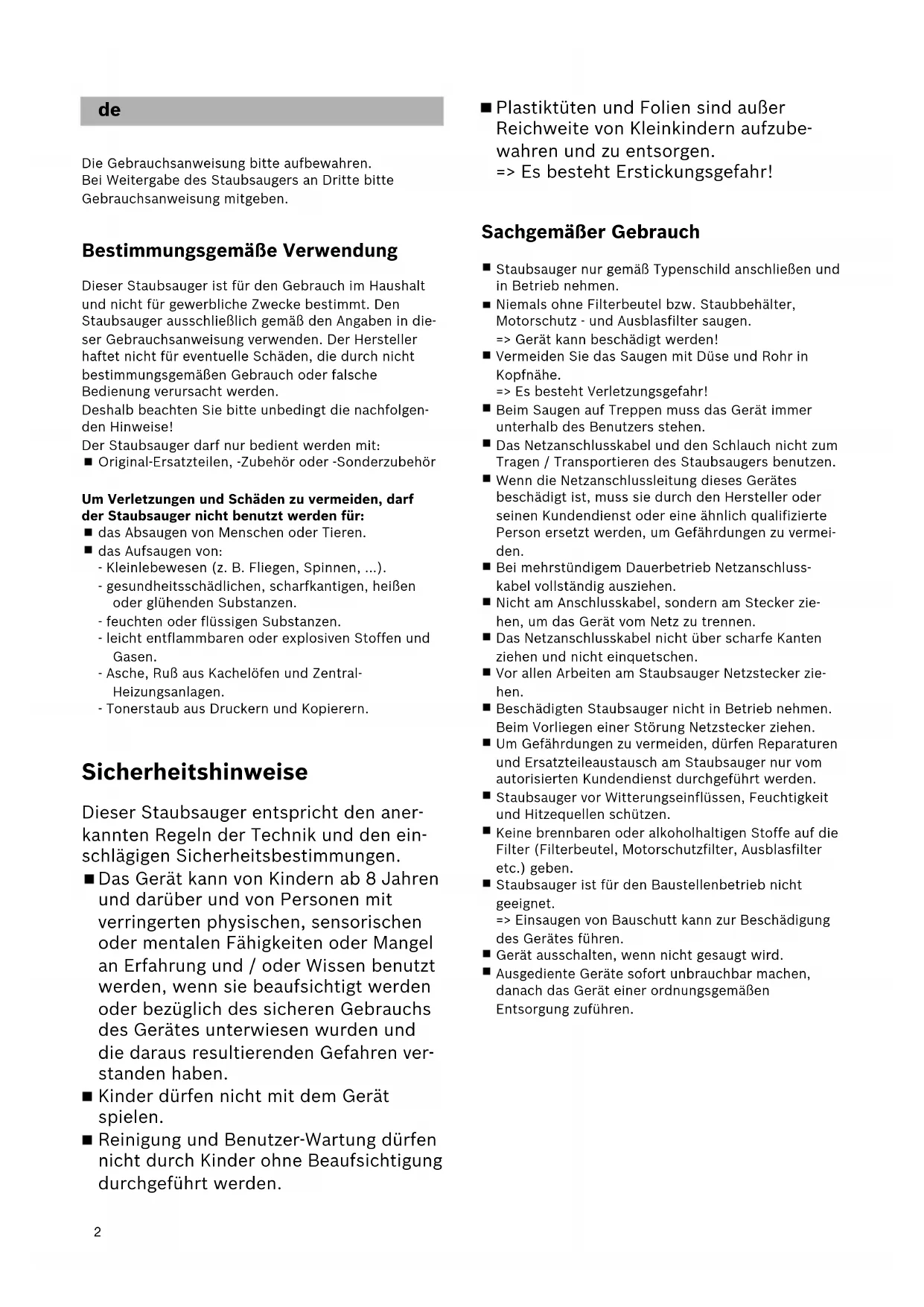 - 75 ar2 Plastiktüten und Folien sind außer Reichweite von Kleinkindern aufzube- wahren und zu entsorgen. => Es besteht Erstickungsgefahr! Sachgemäßer Gebrauch Staubsauger nur gemäß Typenschild anschließen und in Betrieb nehmen. Niemals ohne Filterbeutel bzw. Staubbehälter, Motorschutz - und Ausblasfilter saugen. => Gerät kann beschädigt werden! Vermeiden Sie das Saugen mit Düse und Rohr in Kopfnähe. => Es besteht Verletzungsgefahr! Beim Saugen auf Treppen muss das Gerät immer unterhalb des Benutzers stehen. Das Netzanschlusskabel und den Schlauch nicht zum Tragen / Transportieren des Staubsaugers benutzen. Wenn die Netzanschlussleitung dieses Gerätes beschädigt ist, muss sie durch den Hersteller oder seinen Kundendienst oder eine ähnlich qualifizierte Person ersetzt werden, um Gefährdungen zu vermei- den. Bei mehrstündigem Dauerbetrieb Netzanschluss- kabel vollständig ausziehen. Nicht am Anschlusskabel, sondern am Stecker zie- hen, um das Gerät vom Netz zu trennen. Das Netzanschlusskabel nicht über scharfe Kanten ziehen und nicht einquetschen. Vor allen Arbeiten am Staubsauger Netzstecker zie- hen. Beschädigten Staubsauger nicht in Betrieb nehmen. Beim Vorliegen einer Störung Netzstecker ziehen. Um Gefährdungen zu vermeiden, dürfen Reparaturen und Ersatzteileaustausch am Staubsauger nur vom autorisierten Kundendienst durchgeführt werden. Staubsauger vor Witterungseinflüssen, Feuchtigkeit und Hitzequellen schützen. Keine brennbaren oder alkoholhaltigen Stoffe auf die Filter (Filterbeutel, Motorschutzfilter, Ausblasfilter etc.) geben. Staubsauger ist für den Baustellenbetrieb nicht geeignet. => Einsaugen von Bauschutt kann zur Beschädigung des Gerätes führen. Gerät ausschalten, wenn nicht gesaugt wird. Ausgediente Geräte sofort unbrauchbar machen, danach das Gerät einer ordnungsgemäßen Entsorgung zuführen. p. 29