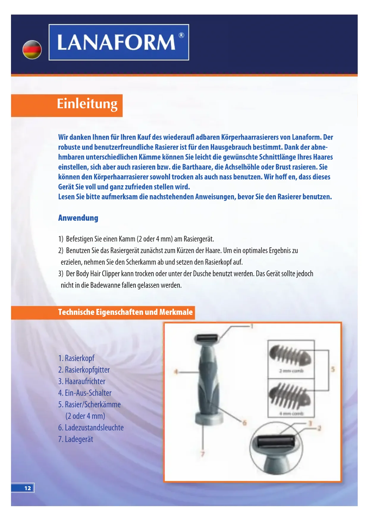 9. Dieses Gerät wurde nicht dafür konzipiert, um von Personen (einschließlich Kindern) mit eingeschränkten geistigen oder sensoriellen Fähigkeiten, unerfahrenen oder nicht sachkundigen Personen benutzt zu werden, außer wenn diese Personen dabei von einer für Ihre Sicherheit haftende Person beaufsichtigt werden und diese Personen über die Bedienungsanleitun- gen des Gerätes informiert wurden. Kinder müssen vom Spielen mit diesem Gerät abgehalten werden.15 Body Hair Clipper Umweltschutz Der Body Hair Clipper enthält au adbare Ni-Cd-Batterien. Wenn die Batterien am Ende sind, nehmen Sie den gesamten Ra- sierkopf ab, indem Sie ihn von vorn ziehen und dabei Ihre Finger mit einem Tuch schützen. Lösen Sie die Schrauben des Kopfs und nehmen Sie erst den Kopf ab. Klopfen Sie mit dem Gerät auf einen Tisch, damit sich das Gehäuse ö net (Tisch mit einem dicken Tuch decken). Schneiden Sie dann die Lötstellen durch und nehmen Sie die Batterie heraus. Bringen Sie die Batterie zu Ihrem Händler oder entsorgen Sie sie entsprechend den geltenden Bestimmungen. BEGRENZTE GARANTIE LANAFORM® garantiert hiermit, dass dieses Produkt frei von irgendwelchen Material- oder Konstruktionsfehlern ist, für einen zweijährigen Zeitraum nach dem Kaufdatum unter Ausschluss der nachstehenden Umstände. Die Garantie dieses Produktes von LANAFORM® umfasst nicht Schäden am Gerät, die infolge einer Zweckentfremdung oder unsachgemäßen Anwendung, eines Unfalls, einer Verwendung nicht zugelassener Zubehörteile, einer Veränderung am garantierten Produkt oder eines anderen Umstandes, der sich der Kontrolle von LANAFORM® entzieht, entstanden sind. LANAFORM® übernimmt keinerlei Haftung oder Verantwortung für Nebenschäden, Folgeschäden oder besondere Schäden am Gerät. Sämtliche indirekten Garantien für die Produkteignung sind auf einen Zeitraum von zwei Jahren ab dem Datum des ersten Kaufs beschränkt. Nach Erhalt des Gerätes repariert oder ersetzt LANAFORM® das Gerät (je nach Fall) und erstattet Ihnen sämtliche Ihnen entstandene Aufwendungen und Kosten. Wurde der Unterhalt oder die P ege dieses Artikels einer anderen Person als dem Kundendienst von LANAFORM® anvertraut, ist diese Garantie null und nichtig.16 Introduction May we take this opportunity of thanking you for choosing the rechargeable Body Hair Clipper from Lanaform. Robust and easy to use, the Body Hair Clipper is intended for domestic use. Its di erent removable combs mean you can easily cut your hair to the length you wish, and also shave yourself, or trim your beard, arms or body. You may use the Body Hair Clipper under both dry and damp conditions. We hope that this product will give you entire satisfaction. Please read the following instructions carefully before using the Body Hair Clipper. Utilisation