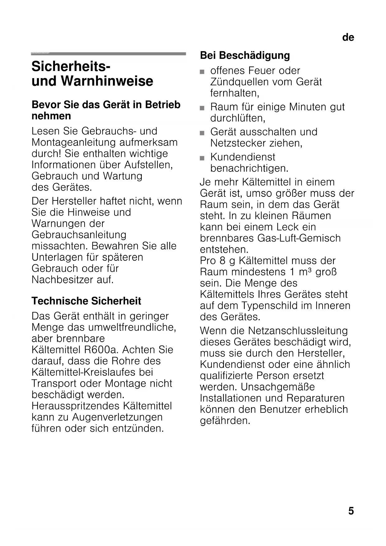deInhaltsverzeichnis deGebrauchsanleitung Sicherheits- und Warnhinweise Bevor Sie das Gerät in Betrieb nehmen Lesen Sie Gebrauchs- und Montageanleitung aufmerksam durch! Sie enthalten wichtige Informationen über Aufstellen, Gebrauch und Wartung des Gerätes. Der Hersteller haftet nicht, wenn Sie die Hinweise und Warnungen der Gebrauchsanleitung missachten. Bewahren Sie alle Unterlagen für späteren Gebrauch oder für Nachbesitzer auf. Technische Sicherheit Das Gerät enthält in geringer Menge das umweltfreundliche, aber brennbare Kältemittel R600a. Achten Sie darauf, dass die Rohre des Kältemittel-Kreislaufes bei Transport oder Montage nicht beschädigt werden. Herausspritzendes Kältemittel kann zu Augenverletzungen führen oder sich entzünden. Bei Beschädigung ■ offenes Feuer oder Zündquellen vom Gerät fernhalten, ■ Raum für einige Minuten gut durchlüften, ■ Gerät ausschalten und Netzstecker ziehen, ■ Kundendienst benachrichtigen. Je mehr Kältemittel in einem Gerät ist, umso größer muss der Raum sein, in dem das Gerät steht. In zu kleinen Räumen kann bei einem Leck ein brennbares Gas-Luft-Gemisch entstehen. Pro 8 g Kältemittel muss der Raum mindestens 1 m³ groß sein. Die Menge des Kältemittels Ihres Gerätes steht auf dem Typenschild im Inneren des Gerätes. Wenn die Netzanschlussleitung dieses Gerätes beschädigt wird, muss sie durch den Hersteller, Kundendienst oder eine ähnlich qualifizierte Person ersetzt werden. Unsachgemäße Installationen und Reparaturen können den Benutzer erheblich gefährden.de