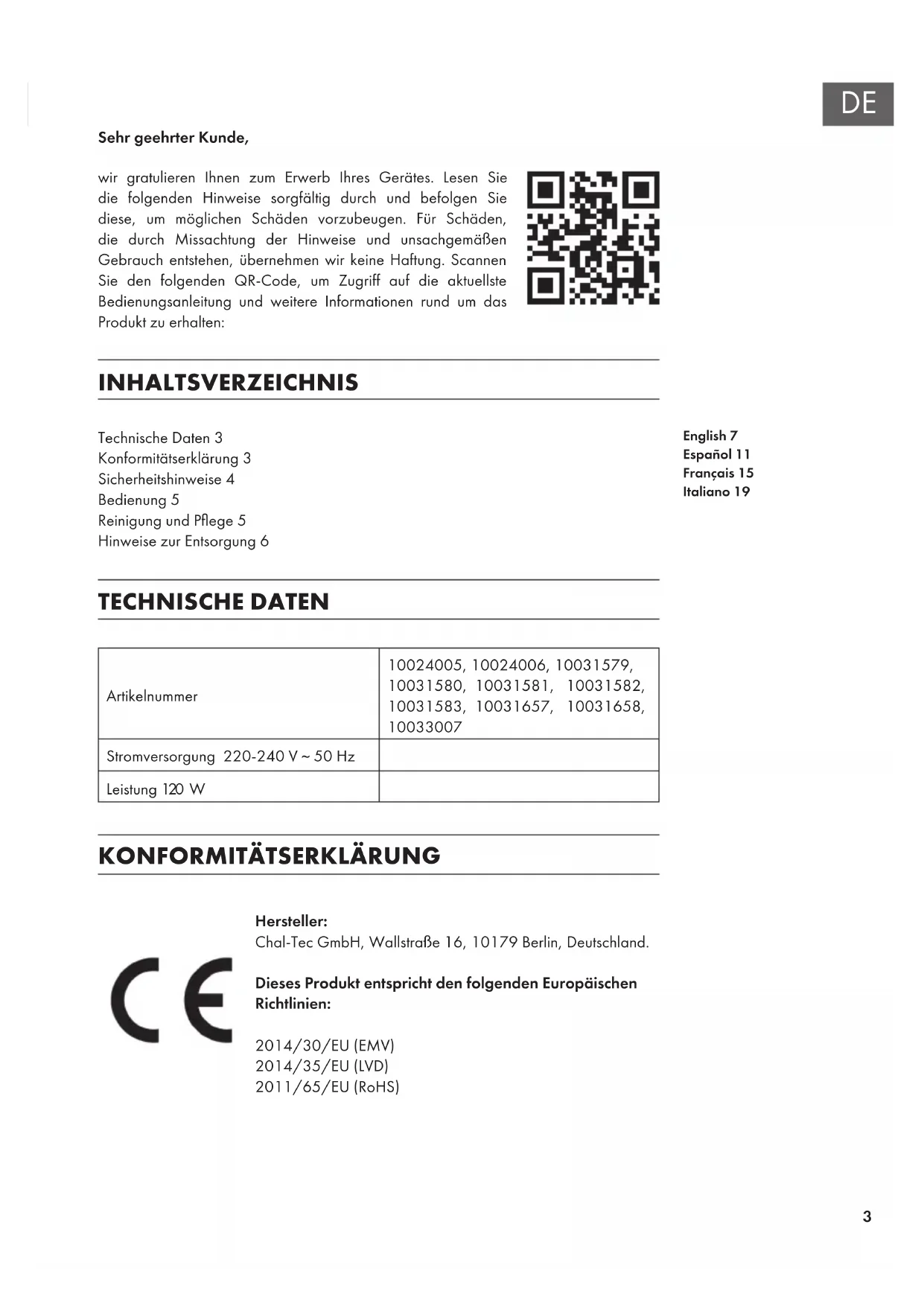 Hersteller: Chal-Tec GmbH, Wallstraße 16, 10179 Berlin, Deutschland. Dieses Produkt entspricht den folgenden Europäischen Richtlinien: 2014/30/EU (EMV) 2014/35/EU (LVD) 2011/65/EU (RoHS) English 7 Español 11 Français 15 Italiano 194