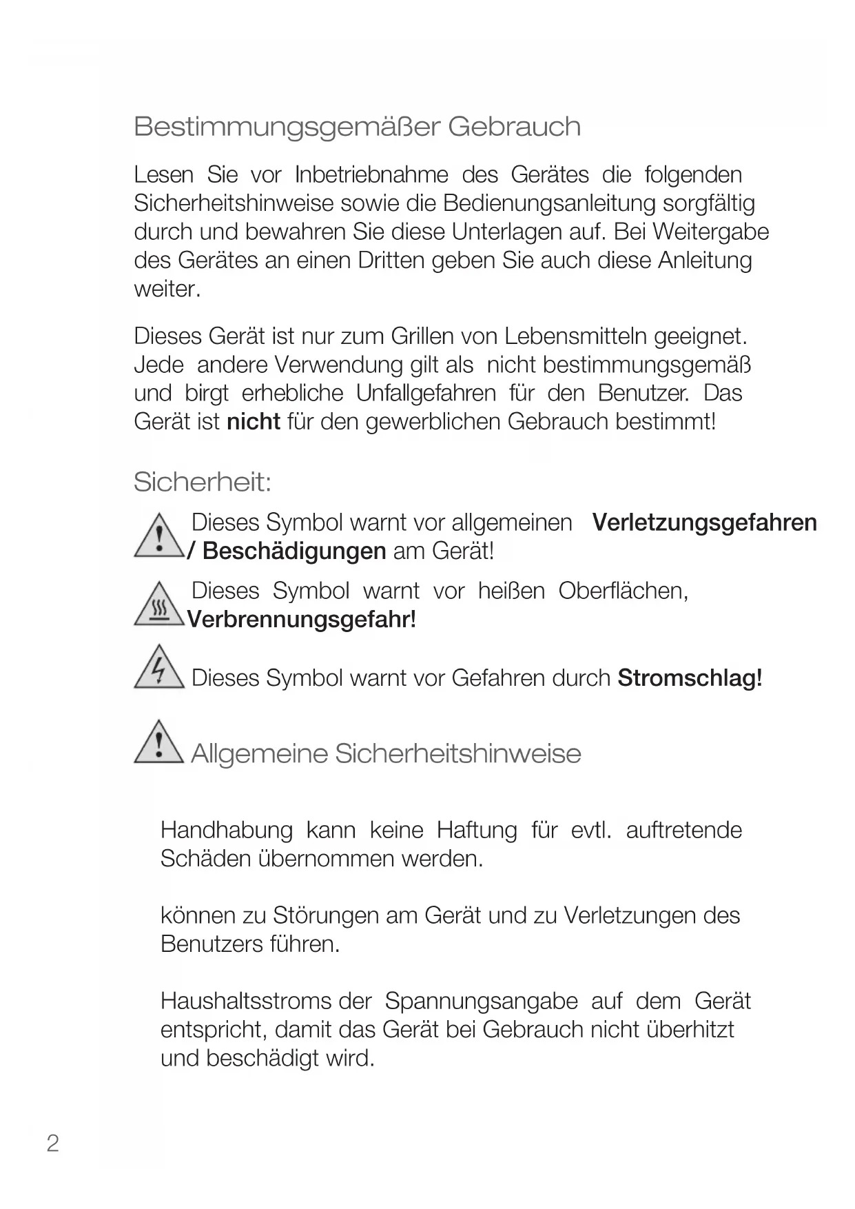 Bestimmungsgemäßer Gebrauch Lesen Sie vor Inbetriebnahme des Gerätes die folgenden Sicherheitshinweise sowie die Bedienungsanleitung sorgfältig durch und bewahren Sie diese Unterlagen auf. Bei Weitergabe des Gerätes an einen Dritten geben Sie auch diese Anleitung weiter. Dieses Gerät ist nur zum Grillen von Lebensmitteln geeignet. Jede andere Verwendung gilt als nicht bestimmungsgemäß und birgt erhebliche Unfallgefahren für den Benutzer. Das Gerät ist nicht für den gewerblichen Gebrauch bestimmt! Sicherheit: Dieses Symbol warnt vor allgemeinen Verletzungsgefahren / Beschädigungen am Gerät! Dieses Symbol warnt vor heißen Oberflächen, Verbrennungsgefahr! Dieses Symbol warnt vor Gefahren durch Stromschlag! Allgemeine Sicherheitshinweise
