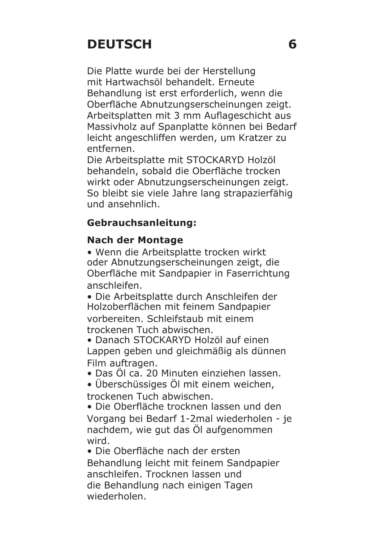 - Never use a steel scourer, scourer pad, souring agent or similar products as they can scratch the surface WARNING Soak any used cloth impregnated with this product in water immediately after use, or store in an airtight glass or metal container to prevent the risk of self-ignition.6 Die Platte wurde bei der Herstellung mit Hartwachsöl behandelt. Erneute Behandlung ist erst erforderlich, wenn die Oberäche Abnutzungserscheinungen zeigt. Arbeitsplatten mit 3 mm Auageschicht aus Massivholz auf Spanplatte können bei Bedarf leicht angeschliffen werden, um Kratzer zu entfernen. Die Arbeitsplatte mit STOCKARYD Holzöl behandeln, sobald die Oberäche trocken wirkt oder Abnutzungserscheinungen zeigt. So bleibt sie viele Jahre lang strapazierfähig und ansehnlich. Gebrauchsanleitung: Nach der Montage
