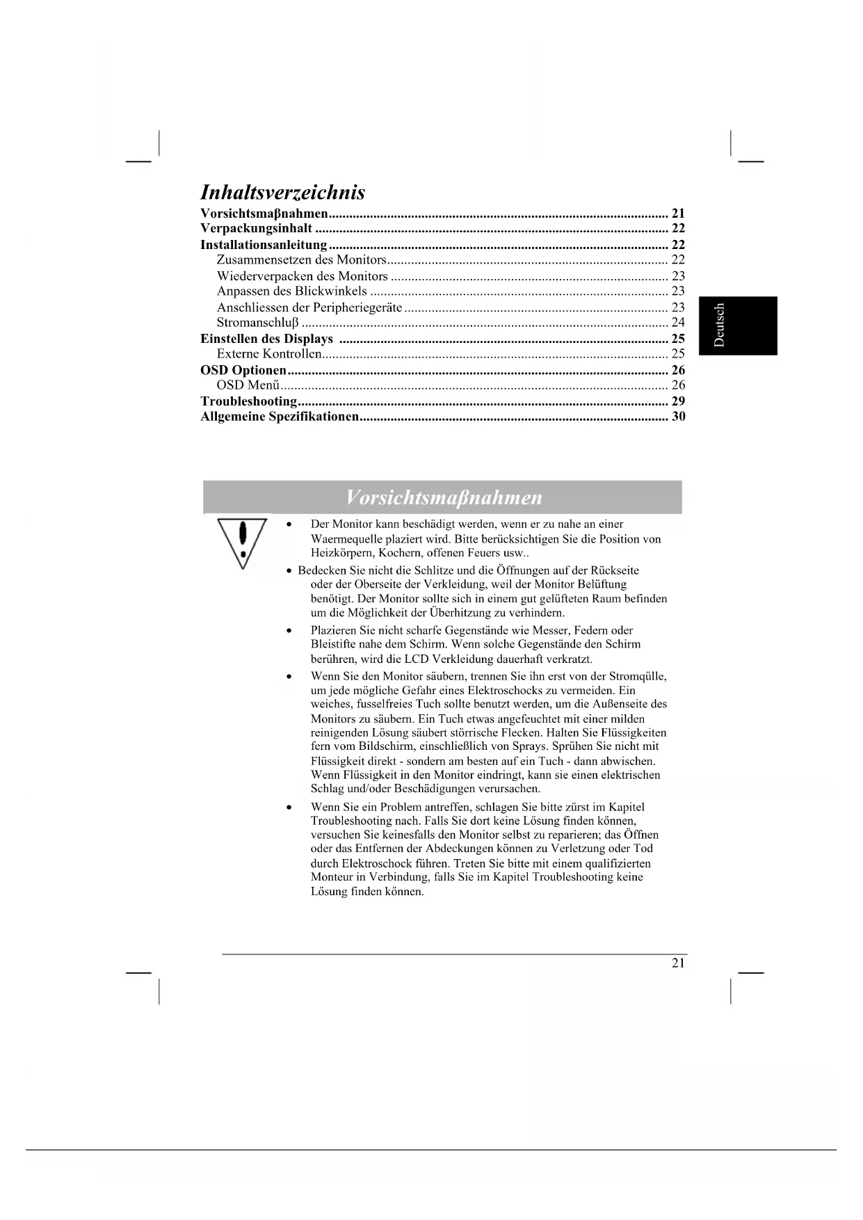 - Wenn Sie ein Problem antreffen, schlagen Sie bitte zűrst im Kapitel Troubleshooting nach. Falls Sie dort keine Lősung finden kőnnen, versuchen Sie keinesfalls den Monitor selbst zu reparieren; das Öffnen oder das Entfernen der Abdeckungen können zu Verletzung oder Tod durch Elektroschock führen. Treten Sie bitte mit einem qualifizierten Monteur in Verbindung, falls Sie im Kapitel Troubleshooting keine Lősung finden kőnnen.22 Deutsch