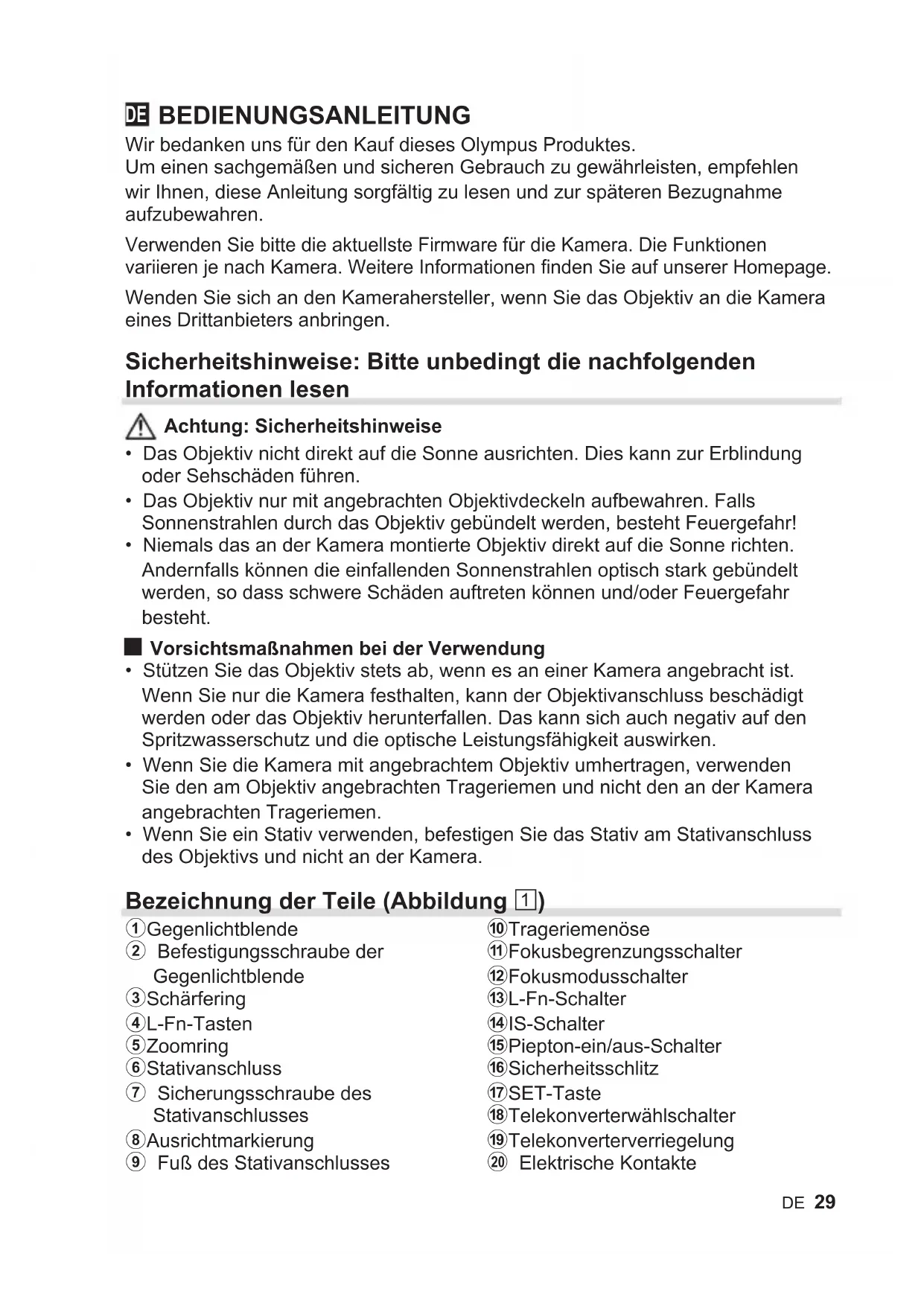 BEDIENUNGSANLEITUNG Wir bedanken uns für den Kauf dieses Olympus Produktes. Um einen sachgemäßen und sicheren Gebrauch zu gewährleisten, empfehlen wir Ihnen, diese Anleitung sorgfältig zu lesen und zur späteren Bezugnahme aufzubewahren. Verwenden Sie bitte die aktuellste Firmware für die Kamera. Die Funktionen variieren je nach Kamera. Weitere Informationen finden Sie auf unserer Homepage. Wenden Sie sich an den Kamerahersteller, wenn Sie das Objektiv an die Kamera eines Drittanbieters anbringen. Sicherheitshinweise: Bitte unbedingt die nachfolgenden Informationen lesen Achtung: Sicherheitshinweise
