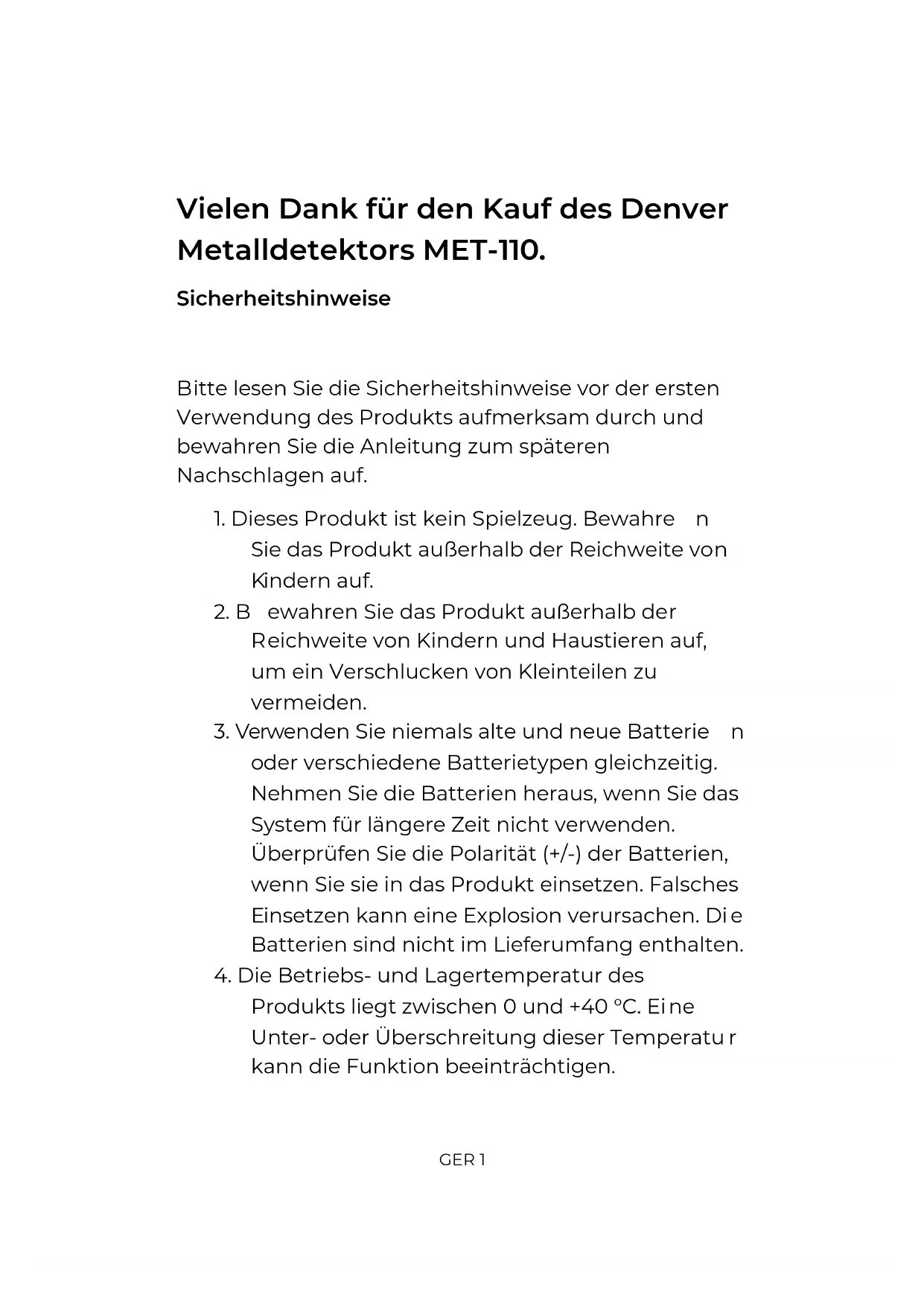 Omega 5A, Soeften DK-8382 Hinnerup Denmark www.facebook.com/denver.euGER 1 Vielen Dank für den Kauf des Denver Metalldetektors MET-110. Sicherheitshinweise