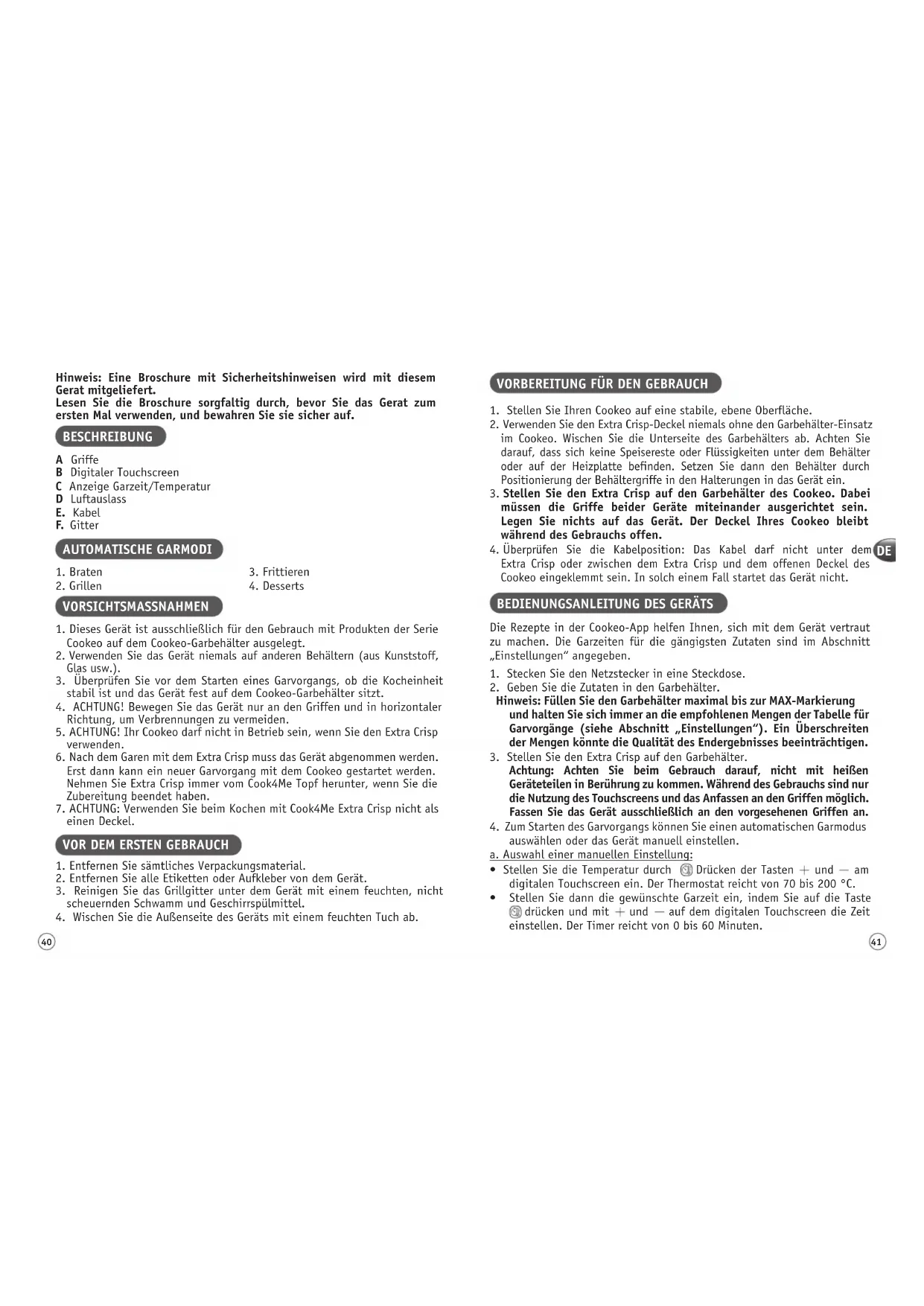 Hinweis: Eine Broschure mit Sicherheitshinweisen wird mit diesem Gerat mitgeliefert. Lesen Sie die Broschure sorgfaltig durch, bevor Sie das Gerat zum ersten Mal verwenden, und bewahren Sie sie sicher auf. BESCHREIBUNG A Griffe B Digitaler Touchscreen C Anzeige Garzeit/Temperatur D Luftauslass E. Kabel F. Gitter AUTOMATISCHE GARMODI 1 Braten 2 Grillen 3 Frittieren 4 Desserts VORSICHTSMASSNAHMEN 1 Dieses Gerät ist ausschließlich für den Gebrauch mit Produkten der Serie Cookeo auf dem Cookeo-Garbehälter ausgelegt 2 Verwenden Sie das Gerät niemals auf anderen Behältern (aus Kunststoff, Glas usw) 3 Überprüfen Sie vor dem Starten eines Garvorgangs, ob die Kocheinheit stabil ist und das Gerät fest auf dem Cookeo-Garbehälter sitzt 4 ACHTUNG! Bewegen Sie das Gerät nur an den Griffen und in horizontaler Richtung, um Verbrennungen zu vermeiden 5 ACHTUNG! Ihr Cookeo darf nicht in Betrieb sein, wenn Sie den Extra Crisp verwenden 6 Nach dem Garen mit dem Extra Crisp muss das Gerät abgenommen werden Erst dann kann ein neuer Garvorgang mit dem Cookeo gestartet werden Nehmen Sie Extra Crisp immer vom Cook4Me Topf herunter, wenn Sie die Zubereitung beendet haben 7 ACHTUNG: Verwenden Sie beim Kochen mit Cook4Me Extra Crisp nicht als einen Deckel 1 Entfernen Sie sämtliches Verpackungsmaterial 2 Entfernen Sie alle Etiketten oder Aufkleber von dem Gerät 3 Reinigen Sie das Grillgitter unter dem Gerät mit einem feuchten, nicht scheuernden Schwamm und Geschirrspülmittel 4 Wischen Sie die Außenseite des Geräts mit einem feuchten Tuch ab