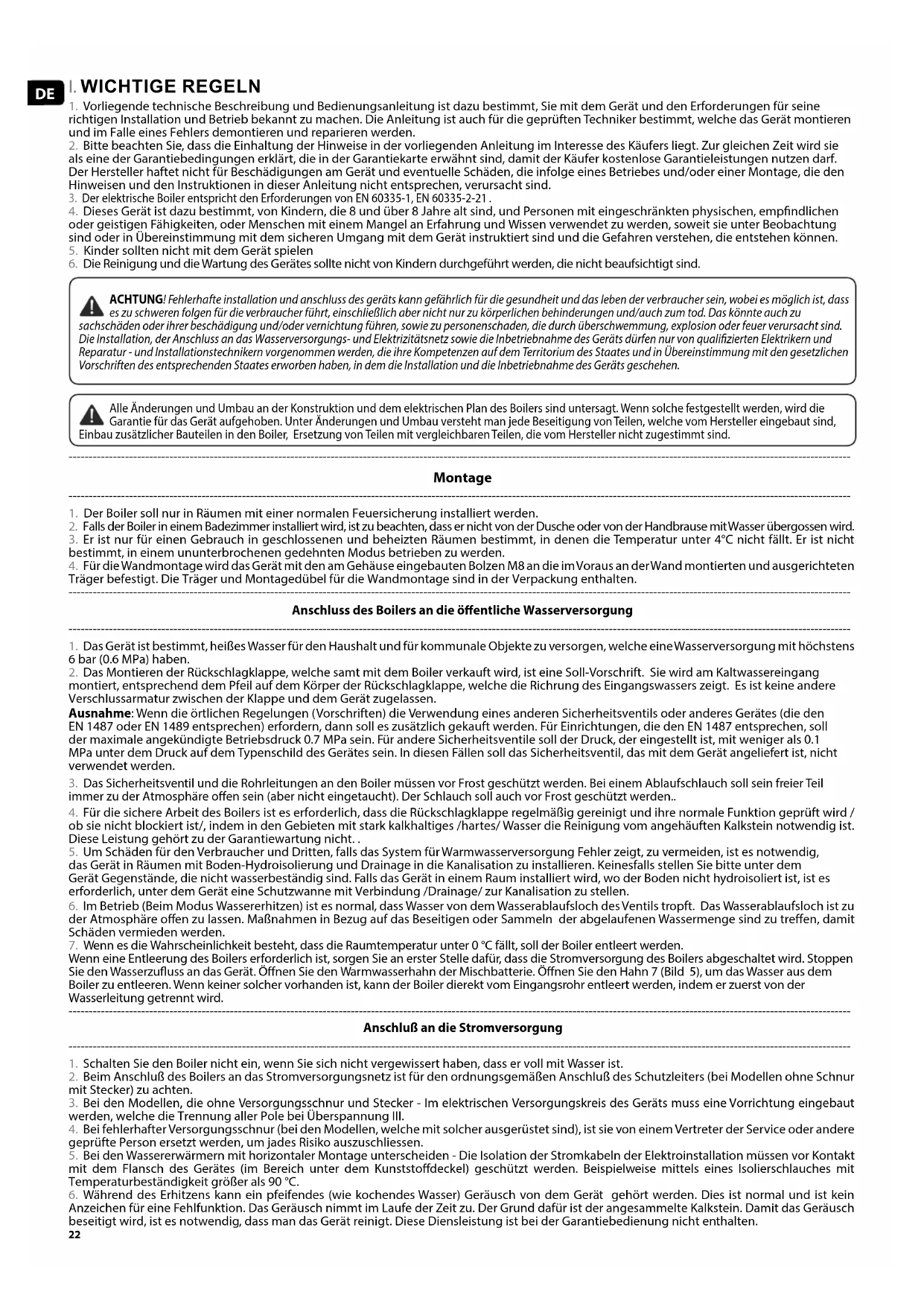 2. Beim Anschluß des Boilers an das Stromversorgungsnetz ist für den ordnungsgemäßen Anschluß des Schutzleiters (bei Modellen ohne Schnur mit Stecker) zu achten. 3. Bei den Modellen, die ohne Versorgungsschnur und Stecker - Im elektrischen Versorgungskreis des Geräts muss eine Vorrichtung eingebaut werden, welche die Trennung aller Pole bei Überspannung III. 4. Bei fehlerhafter Versorgungsschnur (bei den Modellen, welche mit solcher ausgerüstet sind), ist sie von einem Vertreter der Service oder andere geprüfte Person ersetzt werden, um jades Risiko auszuschliessen. 5. Bei den Wassererwärmern mit horizontaler Montage unterscheiden - Die Isolation der Stromkabeln der Elektroinstallation müssen vor Kontakt mit dem Flansch des Gerätes (im Bereich unter dem Kunststodeckel) geschützt werden. Beispielweise mittels eines Isolierschlauches mit Temperaturbeständigkeit größer als 90 °C. 6. Während des Erhitzens kann ein pfeifendes (wie kochendes Wasser) Geräusch von dem Gerät gehört werden. Dies ist normal und ist kein Anzeichen für eine Fehlfunktion. Das Geräusch nimmt im Laufe der Zeit zu. Der Grund dafür ist der angesammelte Kalkstein. Damit das Geräusch beseitigt wird, ist es notwendig, dass man das Gerät reinigt. Diese Diensleistung ist bei der Garantiebedienung nicht enthalten.23Deutsch
