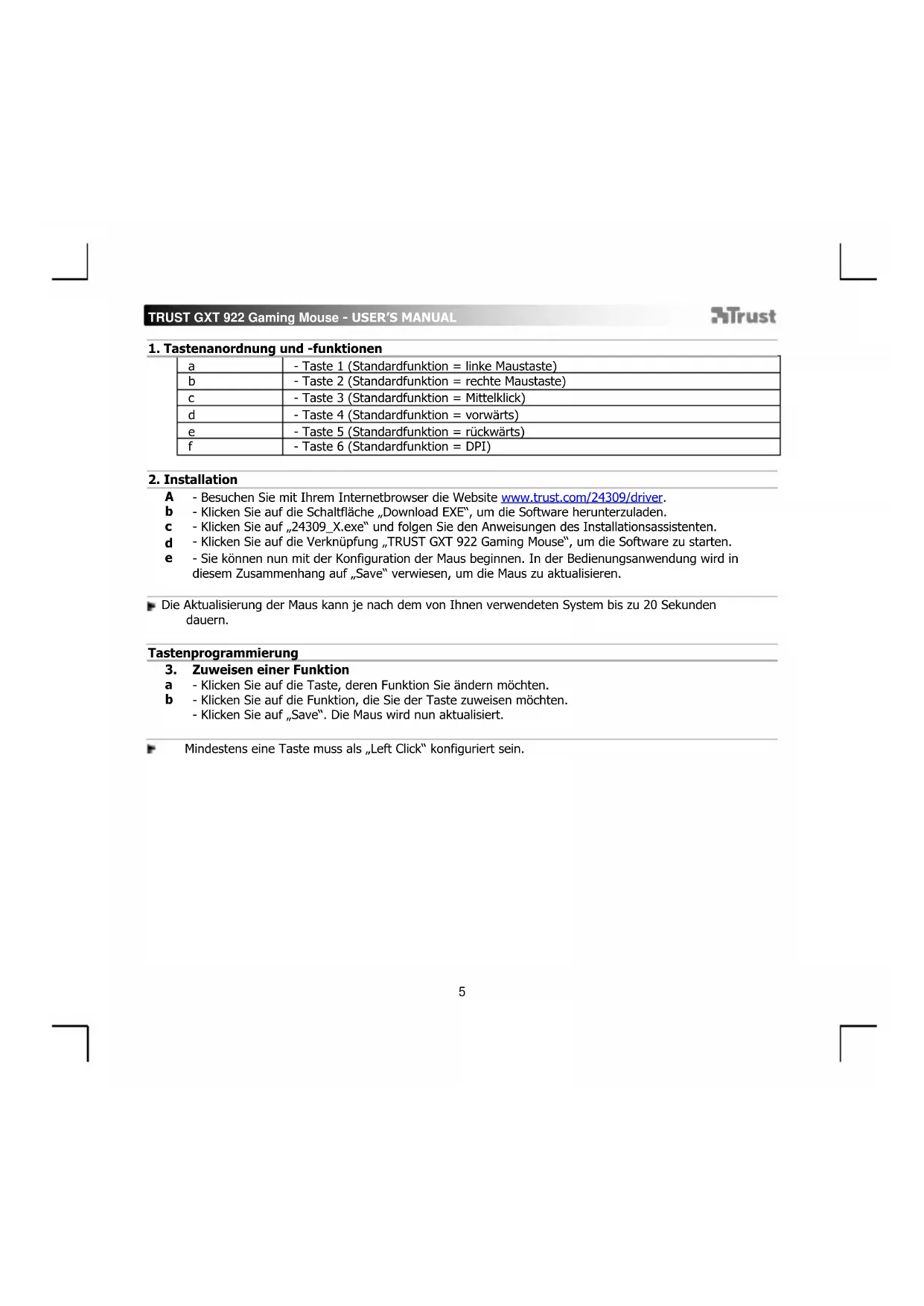 - Besuchen Sie mit Ihrem Internetbrowser die Website www.trust.com/24309/driver. - Klicken Sie auf die Schaltfläche „Download EXE“, um die Software herunterzuladen. - Klicken Sie auf „24309_X.exe“ und folgen Sie den Anweisungen des Installationsassistenten. - Klicken Sie auf die Verknüpfung „TRUST GXT 922 Gaming Mouse“, um die Software zu starten. - Sie können nun mit der Konfiguration der Maus beginnen. In der Bedienungsanwendung wird in diesem Zusammenhang auf „Save“ verwiesen, um die Maus zu aktualisieren. Die Aktualisierung der Maus kann je nach dem von Ihnen verwendeten System bis zu 20 Sekunden dauern. Tastenprogrammierung