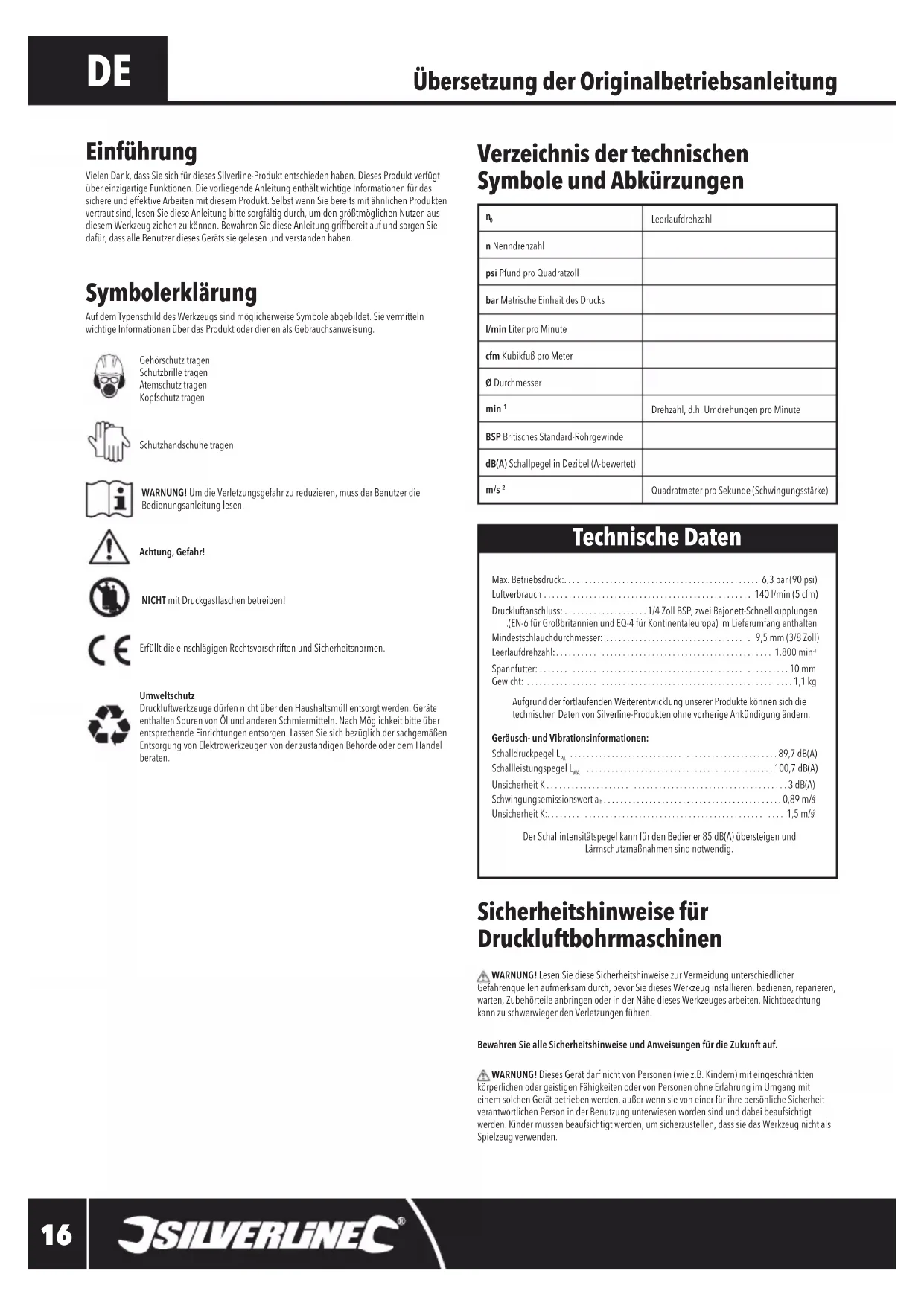 Sicherheitshinweise für Druckluftbohrmaschinen WARNUNG! Lesen Sie diese Sicherheitshinweise zur Vermeidung unterschiedlicher Gefahrenquellen aufmerksam durch, bevor Sie dieses Werkzeug installieren, bedienen, reparieren, warten, Zubehörteile anbringen oder in der Nähe dieses Werkzeuges arbeiten. Nichtbeachtung kann zu schwerwiegenden Verletzungen führen.Bewahren Sie alle Sicherheitshinweise und Anweisungen für die Zukunft auf. WARNUNG! Dieses Gerät darf nicht von Personen (wie z.B. Kindern) mit eingeschränkten körperlichen oder geistigen Fähigkeiten oder von Personen ohne Erfahrung im Umgang mit einem solchen Gerät betrieben werden, außer wenn sie von einer für ihre persönliche Sicherheit verantwortlichen Person in der Benutzung unterwiesen worden sind und dabei beaufsichtigt werden. Kinder müssen beaufsichtigt werden, um sicherzustellen, dass sie das Werkzeug nicht als Spielzeug verwenden. Übersetzung der Originalbetriebsanleitung Symbolerklärung Auf dem Typenschild des Werkzeugs sind möglicherweise Symbole abgebildet. Sie vermitteln wichtige Informationen über das Produkt oder dienen als Gebrauchsanweisung.Gehörschutz tragen Schutzbrille tragen Atemschutz tragen Kopfschutz tragenSchutzhandschuhe tragenWARNUNG! Um die Verletzungsgefahr zu reduzieren, muss der Benutzer die Bedienungsanleitung lesen.Achtung, Gefahr!NICHT mit Druckgasaschen betreiben!Erfüllt die einschlägigen Rechtsvorschriften und Sicherheitsnormen. Umweltschutz Druckluftwerkzeuge dürfen nicht über den Haushaltsmüll entsorgt werden. Geräte enthalten Spuren von Öl und anderen Schmiermitteln. Nach Möglichkeit bitte über entsprechende Einrichtungen entsorgen. Lassen Sie sich bezüglich der sachgemäßen Entsorgung von Elektrowerkzeugen von der zuständigen Behörde oder dem Handel beraten. Einführung Vielen Dank, dass Sie sich für dieses Silverline-Produkt entschieden haben. Dieses Produkt verfügt über einzigartige Funktionen. Die vorliegende Anleitung enthält wichtige Informationen für das sichere und effektive Arbeiten mit diesem Produkt. Selbst wenn Sie bereits mit ähnlichen Produkten vertraut sind, lesen Sie diese Anleitung bitte sorgfältig durch, um den größtmöglichen Nutzen aus diesem Werkzeug ziehen zu können. Bewahren Sie diese Anleitung griffbereit auf und sorgen Sie dafür, dass alle Benutzer dieses Geräts sie gelesen und verstanden haben.