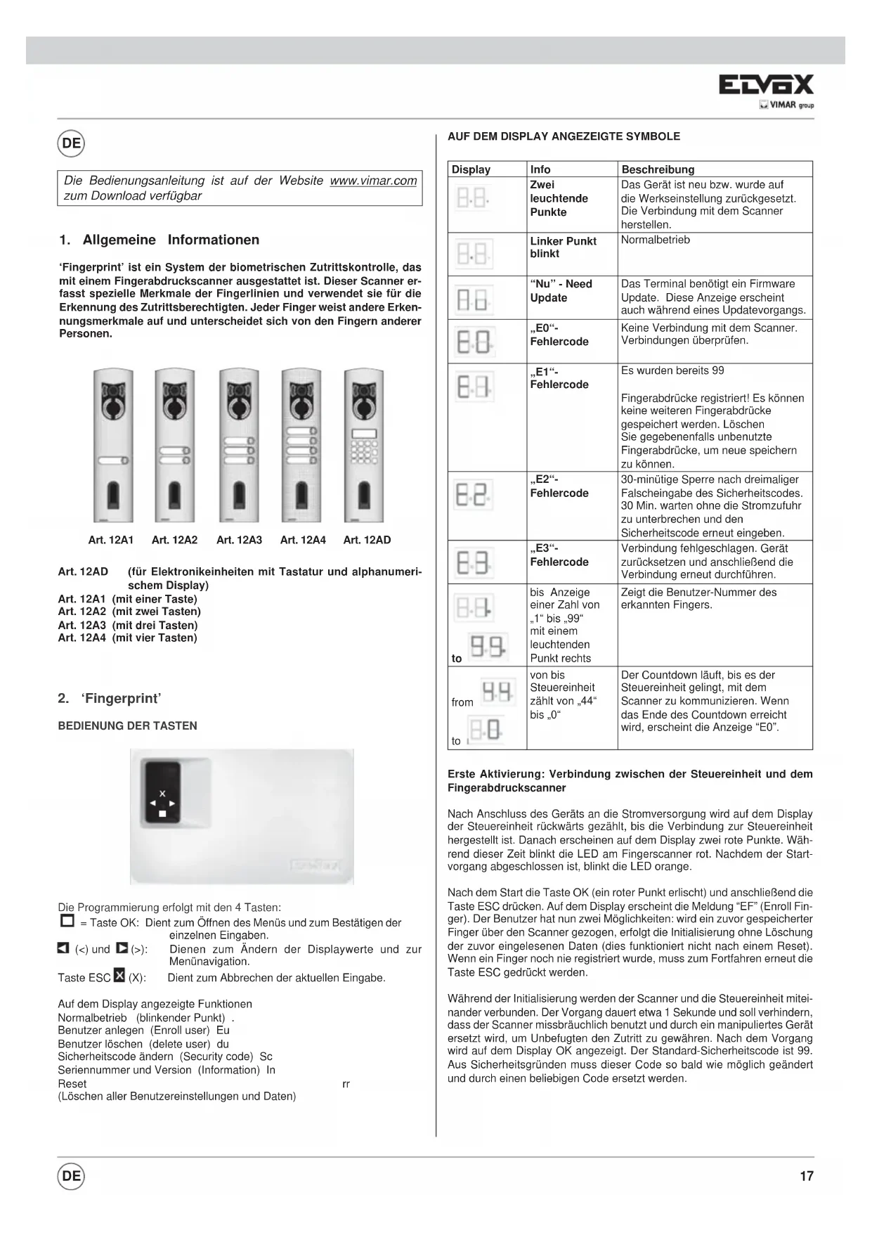 ‘Fingerprint’ ist ein System der biometrischen Zutrittskontrolle, das mit einem Fingerabdruckscanner ausgestattet ist. Dieser Scanner er- fasst spezielle Merkmale der Fingerlinien und verwendet sie für die Erkennung des Zutrittsberechtigten. Jeder Finger weist andere Erken- nungsmerkmale auf und unterscheidet sich von den Fingern anderer Personen. Art. 12AD (für Elektronikeinheiten mit Tastatur und alphanumeri- schem Display) Art. 12A1 (mit einer Taste) Art. 12A2 (mit zwei Tasten) Art. 12A3 (mit drei Tasten) Art. 12A4 (mit vier Tasten) Art. 12A1 Art. 12A2 Art. 12A3 Art. 12A4 Art. 12AD
