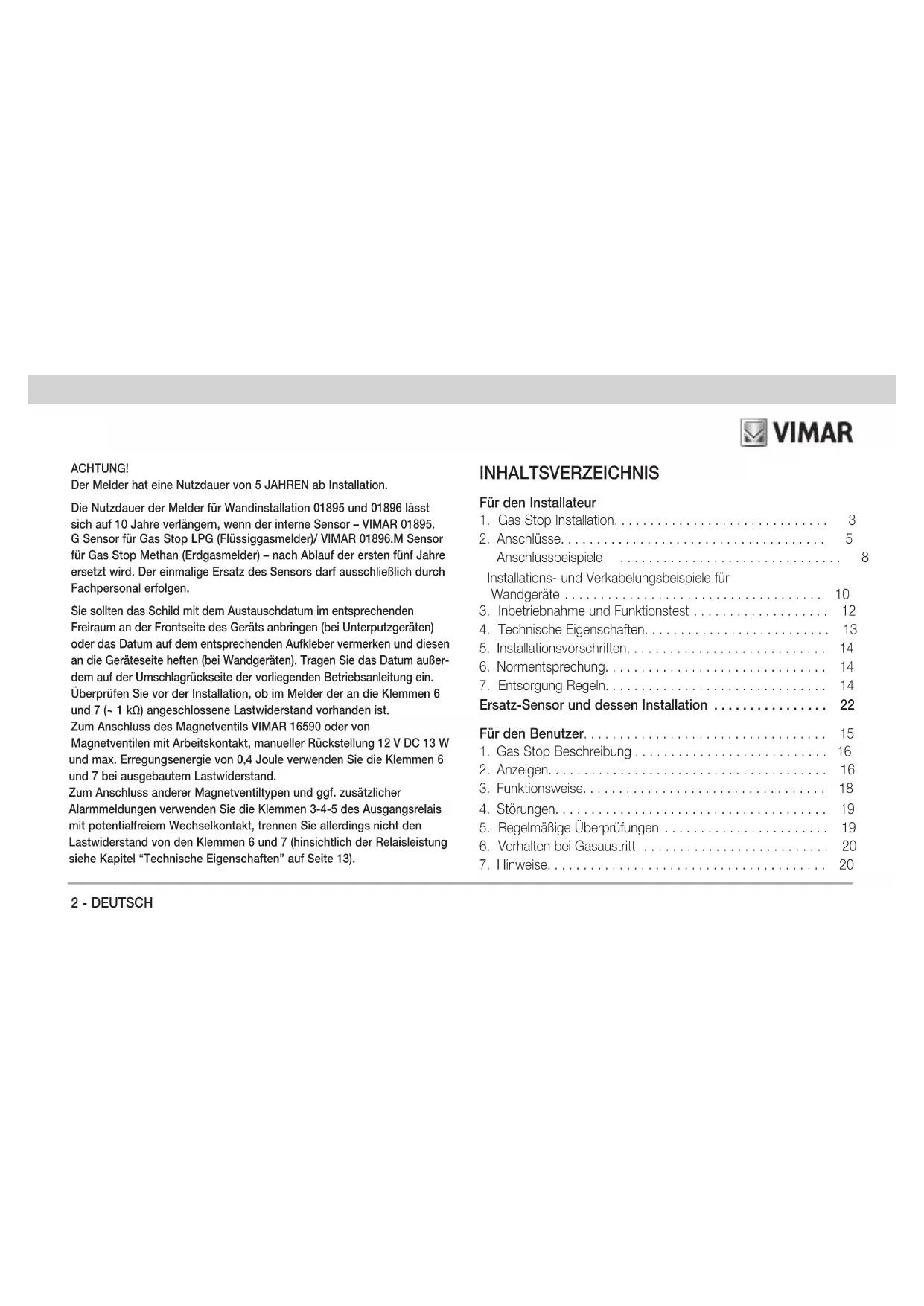 können zu entsorgende Produkte mit Abmessungen unter 25 cm kostenlos und ohne Kaufzwang abgegeben werden. Die angemessene Mülltrennung für das dem Recycling, der Behandlung und der umweltverträglichen Entsorgung zu- geführten Gerätes trägt dazu bei, mögliche negative Auswirkungen auf die Umwelt und die Gesundheit zu vermeiden und begünstigt den Wiederein- satz und/oder das Recyceln der Materialien, aus denen das Gerat besteht.Für den Benutzer ACHTUNG Der von Ihnen erworbene Gasmelder ist ein technologisch ausgereiftes, nach den geltenden technischen Normen sowie EG- Richtlinien entwickeltes und hergestelltes Produkt. Der Melder hat eine Nutzdauer von 5 JAHREN ab Installation. Die Nutzdauer der Melder für Wandinstallation 01895 und 01896 lässt sich auf 10 Jahre verlängern, wenn der interne Sensor – VIMAR 01895.G Sensor für Gas Stop LPG (Flüssiggasmelder)/ VIMAR 01896.M Sensor für Gas Stop Methan (Erdgasmelder) – nach Ablauf der ersten fünf Jahre ersetzt wird. Der einmalige Ersatz des Sensors darf ausschließlich durch Fachpersonal erfol- gen (Seite 2). Lesen Sie die Anleitungen sorgfältig durch. Vergessen Sie nicht, Ihren Installateur nach Ablauf der Nutzdauer mit dem notwendigen Austausch des Geräts zu beauftragen. Der Installateur muss das Austauschdatum des Geräts mit dem entsprechenden Schild/Etikett bei der Inbetriebnahme vermerken. INSTALLATIONSHINWEISE Wenden Sie sich an autorisiertes Fachpersonal für die Installation, die planmäßige und außerplanmäßige Wartung sowie für die Stilllegung des Geräts.