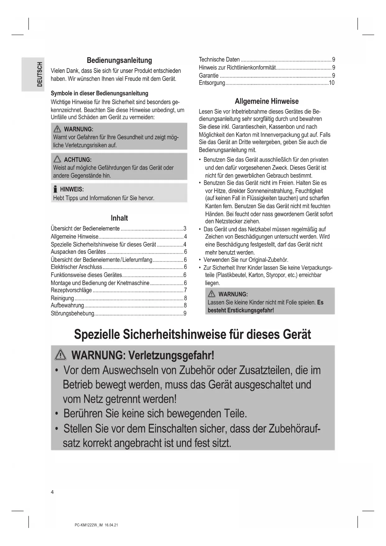 - Verarbeiten Sie mit der Maschine nur Lebensmittel. Der Miss- brauch zu anderen Zwecken kann Verletzungen zur Folge haben.6 PC-KM1222W_IM 16.04.21 Auspacken des Gerätes