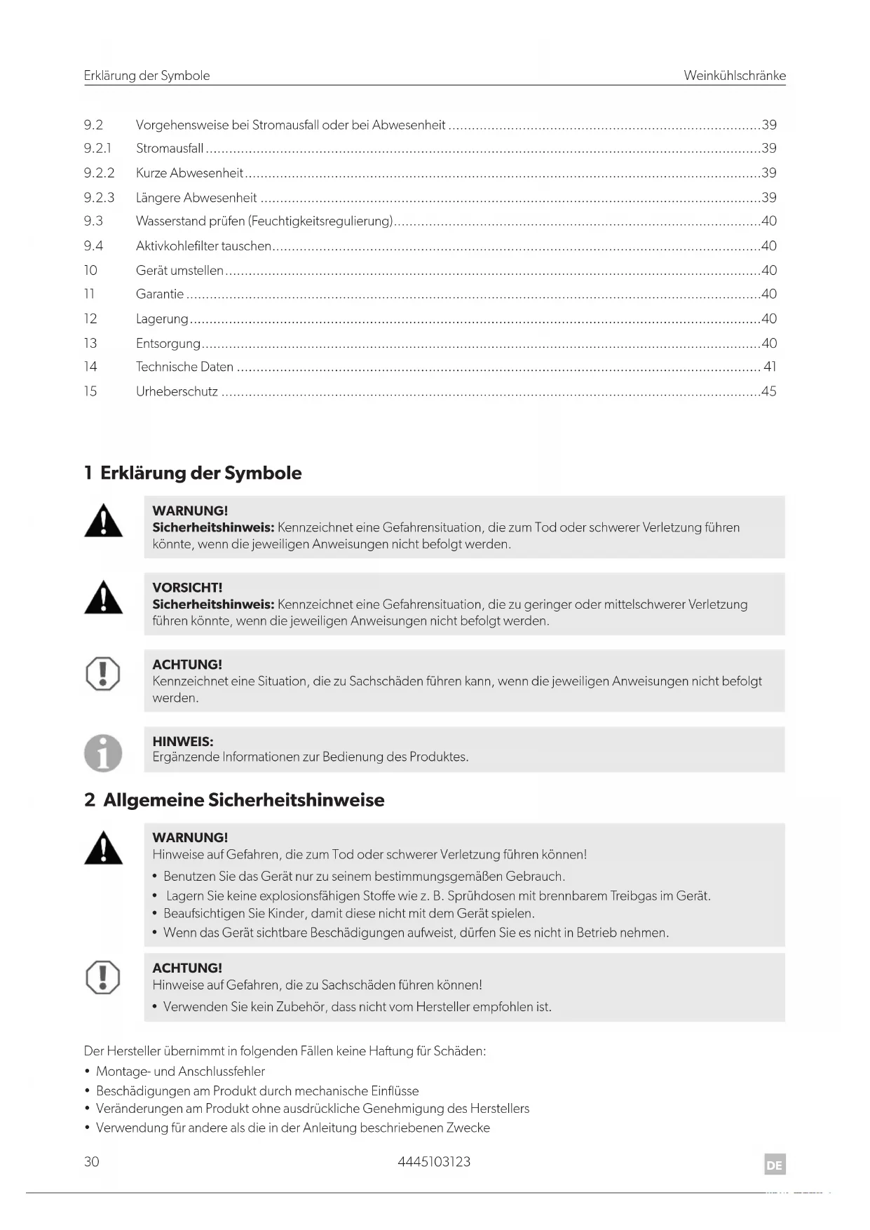 - SorgenSieimmerfüreineguteBelüung,umFeuchtigkeitzuvermeiden. 13 Entsorgung Geben Sie das Verpackungsmaterial möglichst in den entsprechenden Recycling-Müll. WennSiedasProduktendgültigentsorgenmöchten,informierenSiesichbittebeiIhremWertstohofvorOrt oderbeiIhremFachhändlerüberdiezutreendenEntsorgungsvorschrien. Schützen Sie Ihre Umwelt! Akkus und Batterien gehören nicht in den Hausmüll. Geben Sie bitte Ihre defekten Akkus oder verbrauchten Batterien beim Händler oder bei einer Sammelstelle ab.4445103123 41 Weinkühlschränke Technische Daten