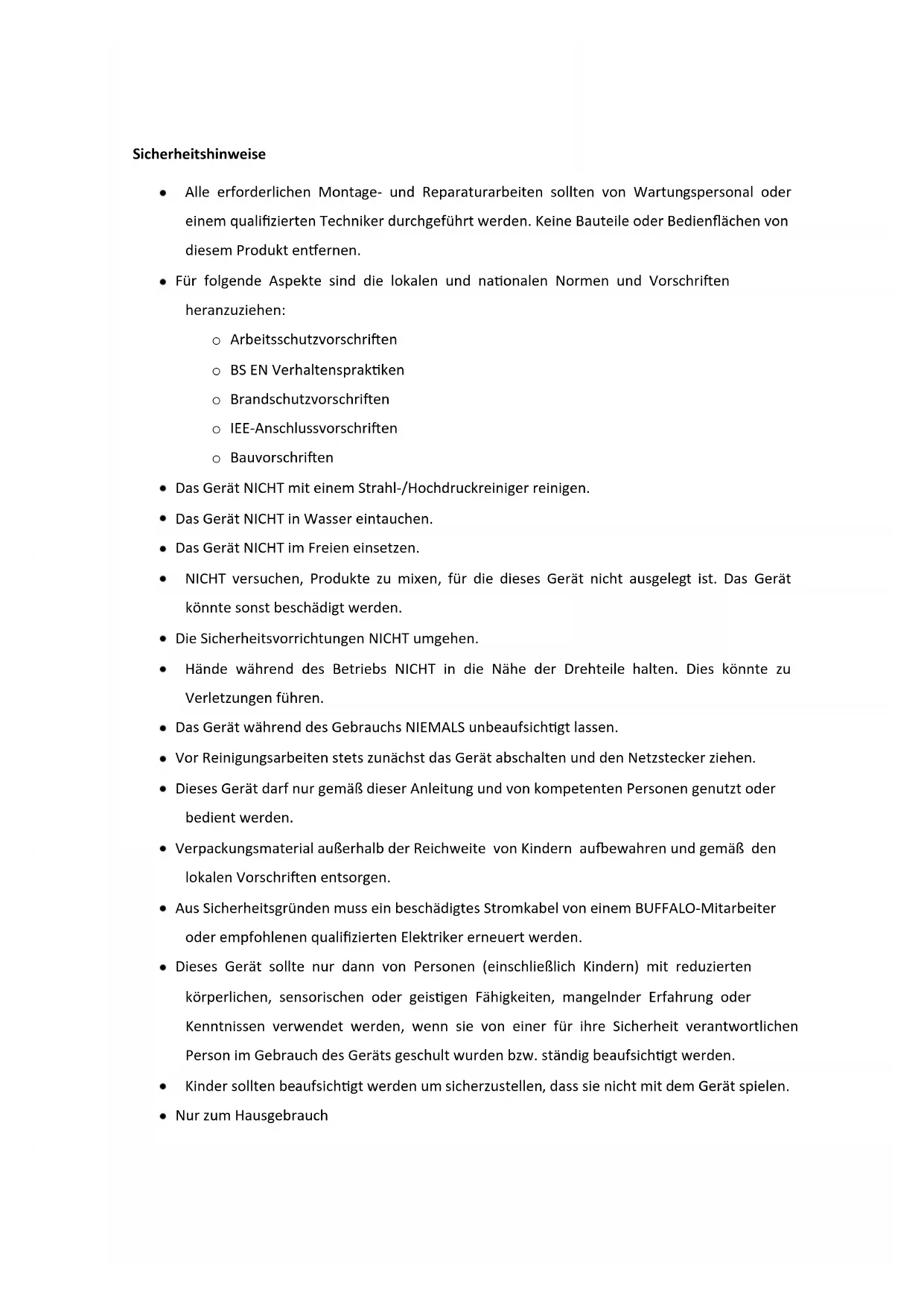 - Aus Sicherheitsgründen muss ein beschädigtes Stromkabel von einem BUFFALO-Mitarbeiter oder empfohlenen qualifizierten Elektriker erneuert werden.