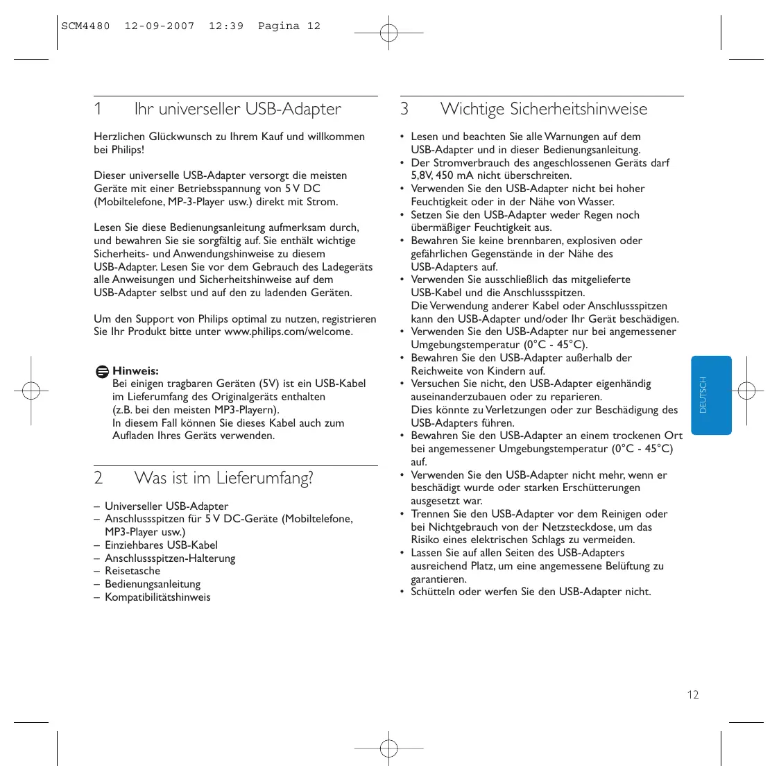 12-09-2007 12:39 Pagina 12 Ihr universeller USB-Adapter Herzlichen Glückwunsch zu Ihrem Kauf und willkommen bei Philips! Dieser universelle USB-Adapter versorgt die meisten Geräte mit einer Betriebsspannung von 5 V DC (Mobiltelefone, MP-3-Player usw.) direkt mit Strom. Lesen Sie diese Bedienungsanleitung aufmerksam durch, und bewahren Sie sie sorgfältig auf. Sie enthält wichtige Sicherheits- und Anwendungshinweise zu diesem USB-Adapter. Lesen Sie vor dem Gebrauch des Ladegeräts alle Anweisungen und Sicherheitshinweise auf dem USB-Adapter selbst und auf den zu ladenden Geräten. Um den Support von Philips optimal zu nutzen, registrieren Sie Ihr Produkt bitte unter www.philips.com/welcome. Hinweis: Bei einigen tragbaren Geräten (5V) ist ein USB-Kabel im Lieferumfang des Originalgeräts enthalten (z.B. bei den meisten MP3-Playern). In diesem Fall können Sie dieses Kabel auch zum Aufladen Ihres Geräts verwenden.