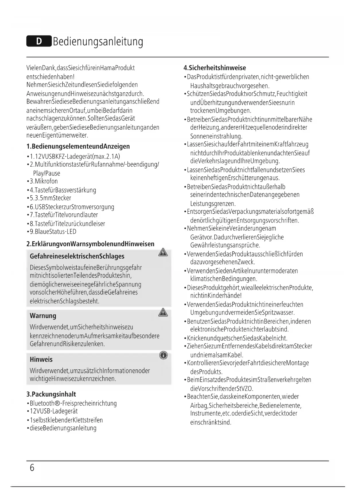 Connection 3.5 mm jack plug Max. range 10 m Cable length 1 m Power supply 12 V USB car charger Bluetooth® version 5.1 Frequency band(s) 2.40 GHz – 2.48 GHz Maximum radio- frequency power transmitted Max. 4 dBm 12.Declaration of Conformity Hama GmbH & Co KG hereby declares that the radio equipment type [00014167] is in compliance with Directive 2014/53/EU. The full text of the EU declaration of conformity can be found on the following website: www.hama.com-> 00014167-> Downloads.6 D Bedienungsanleitung Vielen Dank, dass Sie sich für ein Hama Produkt entschieden haben! Nehmen Sie sich Zeit und lesen Sie die folgenden Anweisungen und Hinweise zunächst ganz durch. Bewahren Sie diese Bedienungsanleitung anschließend an einem sicheren Ort auf, um bei Bedarf darin nachschlagen zu können. Sollten Sie das Gerät veräußern, geben Sie diese Bedienungsanleitung an den neuen Eigentümer weiter. 1.Bedienungselemente und Anzeigen