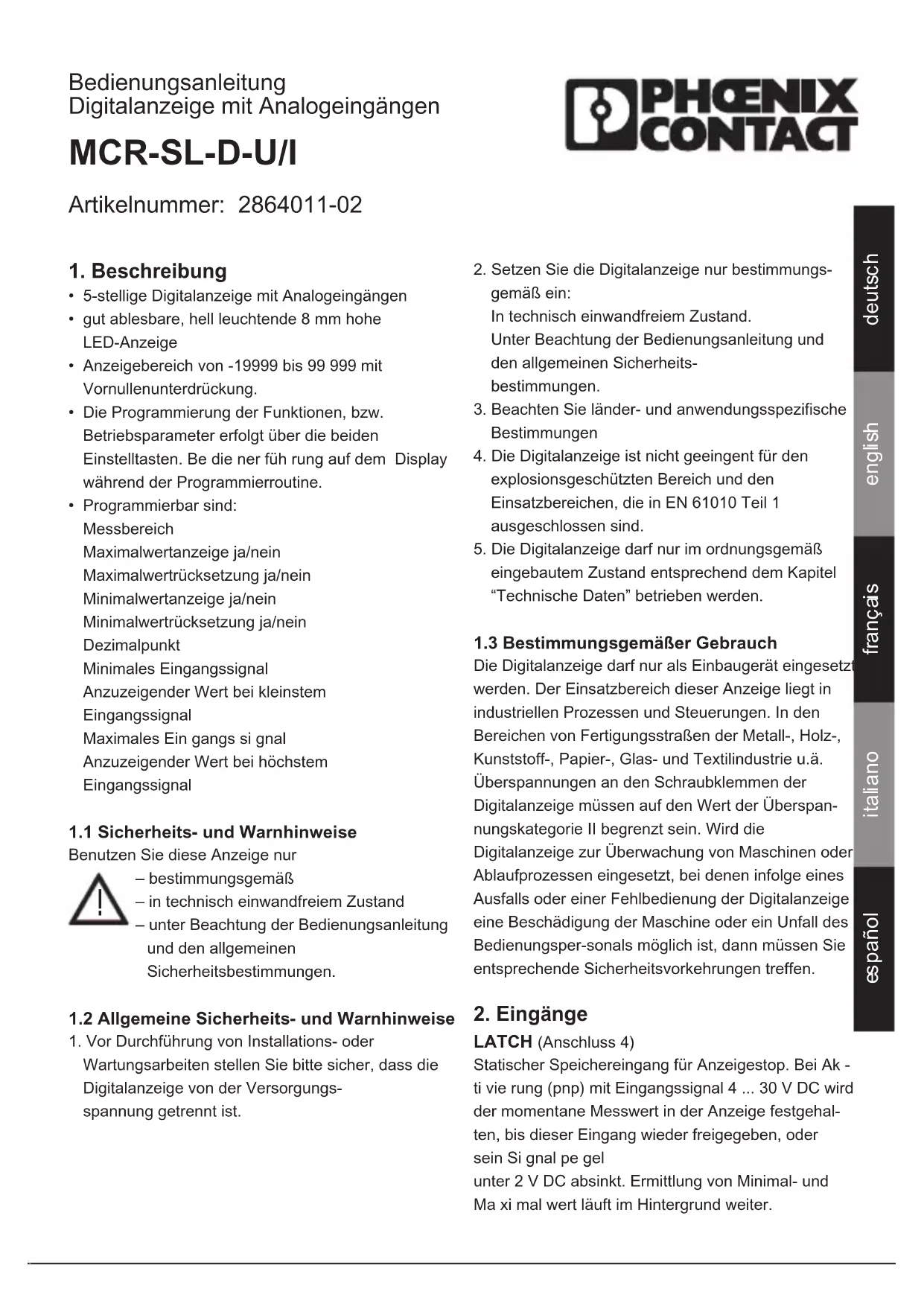 Bedienungsanleitung Digitalanzeige mit Analogeingängen MCR-SL-D-U/I Artikelnummer: 2864011-02