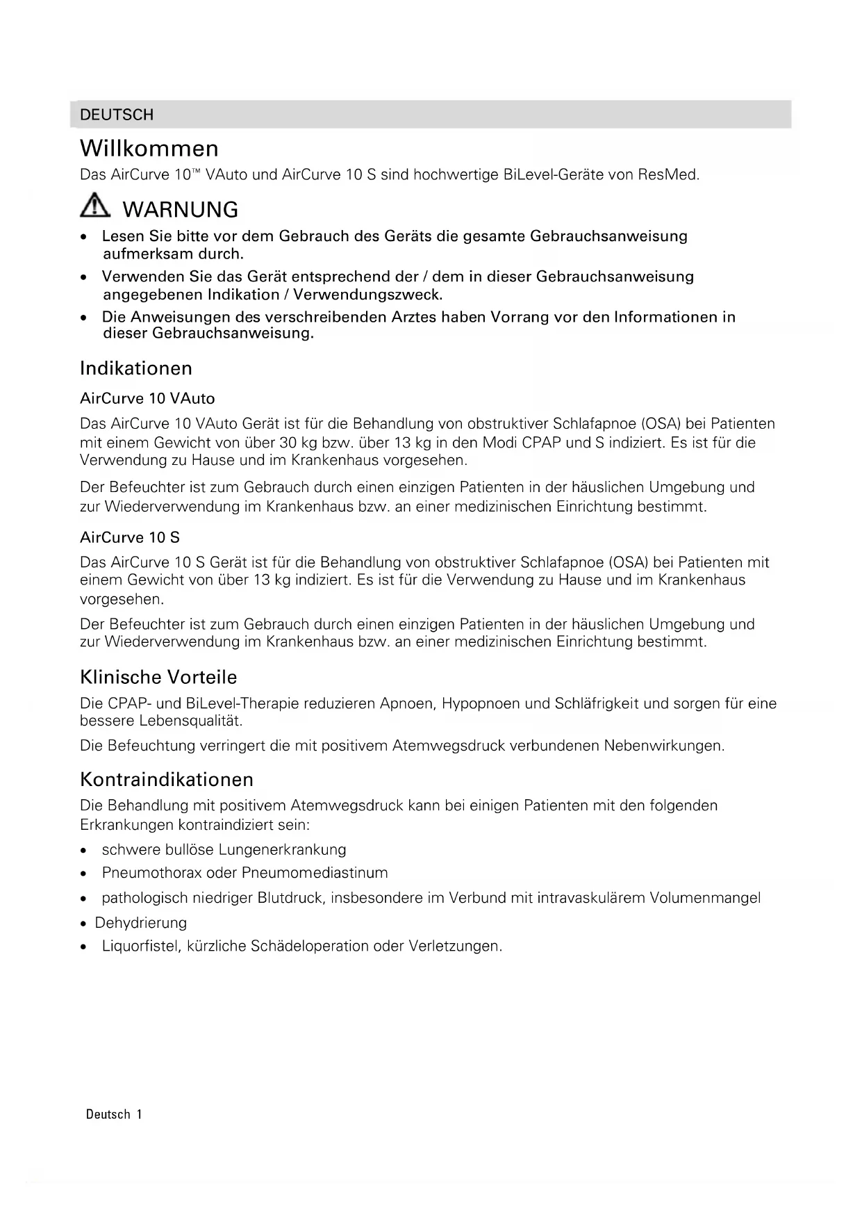 - Die Anweisungen des verschreibenden Arztes haben Vorrang vor den Informationen in dieser Gebrauchsanweisung. Indikationen AirCurve 10 VAuto Das AirCurve 10 VAuto Gerät ist für die Behandlung von obstruktiver Schlafapnoe (OSA) bei Patienten mit einem Gewicht von über 30 kg bzw. über 13 kg in den Modi CPAP und S indiziert. Es ist für die Verwendung zu Hause und im Krankenhaus vorgesehen. Der Befeuchter ist zum Gebrauch durch einen einzigen Patienten in der häuslichen Umgebung und zur Wiederverwendung im Krankenhaus bzw. an einer medizinischen Einrichtung bestimmt. AirCurve 10 S Das AirCurve 10 S Gerät ist für die Behandlung von obstruktiver Schlafapnoe (OSA) bei Patienten mit einem Gewicht von über 13 kg indiziert. Es ist für die Verwendung zu Hause und im Krankenhaus vorgesehen. Der Befeuchter ist zum Gebrauch durch einen einzigen Patienten in der häuslichen Umgebung und zur Wiederverwendung im Krankenhaus bzw. an einer medizinischen Einrichtung bestimmt. Klinische Vorteile Die CPAP- und BiLevel-Therapie reduzieren Apnoen, Hypopnoen und Schläfrigkeit und sorgen für eine bessere Lebensqualität. Die Befeuchtung verringert die mit positivem Atemwegsdruck verbundenen Nebenwirkungen. Kontraindikationen Die Behandlung mit positivem Atemwegsdruck kann bei einigen Patienten mit den folgenden Erkrankungen kontraindiziert sein: