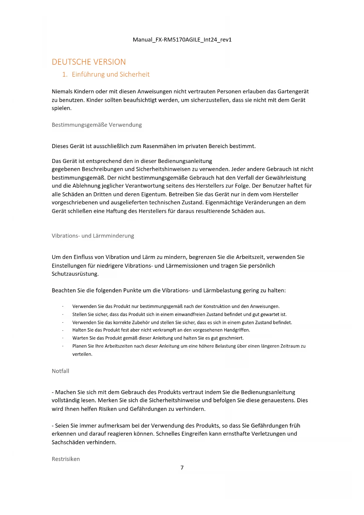 Allgemeine Sicherheitshinweise - Lesen Sie zu Ihrer Sicherheit und für die Sicherheit anderer diese Bedienungsanleitung und ihre Sicherheitshinweise, bevor Sie das Gerät benutzen. Bitte bewahren Sie Bedienungsanleitung und ihre Sicherheitshinweise für den späteren Gebrauch sicher auf und halten diese für jeden Einsatz griffbereit. - Geben Sie die Betriebsanleitung bei einem Besitzerwechsel mit dem Gerät weiter. - Personen, die das Gerät bedienen, dürfen nicht unter dem Einfluss von Rauschmitteln (z. B. Alkohol, Drogen oder Medikamenten) stehen. - Betreiben Sie das Gerät nur in dem vom Hersteller vorgeschriebenen und ausgelieferten technischen Zustand. Eigenmächtige Veränderungen am Gerät schließen eine Haftung des Herstellers für daraus resultierende Schäden aus. - Verwenden Sie das Gerät nur bei Tageslicht oder unter guter künstlicher Beleuchtung. - Verwenden Sie das Gerät nur bei trockenen Wetterbedingungen. Halten Sie es von Regen oder Nässe fern. Das Eindringen von Wasser in das Gerät erhöht das Risiko eines elektrischen Schlags. - Schalten Sie bei folgenden Bedingungen das Gerät ab und entfernen Sie den Akku: ⬧ wenn das Gerät unbeaufsichtigt gelassen wird; ⬧ wenn das Gerät beginnt, übermäßig stark zu vibrieren.Manual_FX-RM5170AGILE_Int24_rev1
