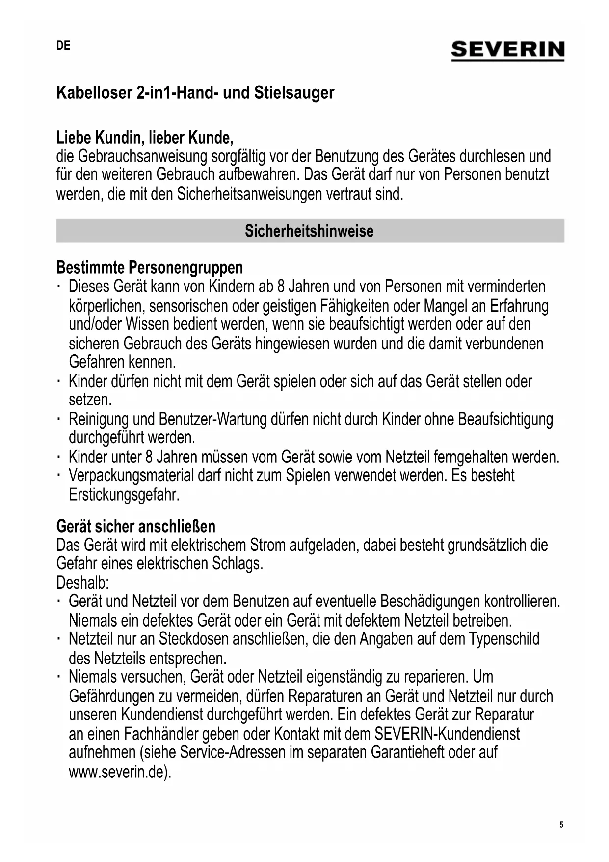Netzteil / Mains adapter / Bloc d’alimentation / Voeding / Fuente de alimentación / Alimentatore / Strømforsyning / Nätdel / Verkkolaite / Fonte de alimentação / Zasilacz / Τροφοδοτικό 22,5 V DC 500 mA Leistung / Power / Puissance / Vermogen / Potencia / Potenza / Effekt / Effekt / Teho / Potência / Moc / Ισχύς 120 W Kapazität Staub / Dust capacity / Volume poussière / Capaciteit stof / Capacidad para polvo / Capacità di raccolta polvere / Støvkapacitet / Kapacitet damm / Pölykapasiteetti / Capacidade de pó / Pojemność dla pyłu / Χωρητικότητα συγκέντρωσης σκόνης 600 ml Saugkraft / Suction power / Puissance d’aspiration / Zuigkracht / Fuerza de aspiración / Forza di aspirazione / Sugekraft / Sugkraft / Imuvoima / Potência de sucção / Siła ssąca / Ισχύς αναρρόφησης 8 kPa Laufzeit / Runtime / Autonomie / Looptijd / Tiempo de funcionamiento / Durata / Driftstid / Drifttid / Käyttöaika / Autonomia / Czas pracy / Αυτονομία ~ 18 Min. (Power-Modus) ~ 18 min (Power mode) ~ 18 min (mode Power) ~ 18 min. (Power-modus) ~ 18 min (modo Power) ~ 18 min (modalità Power) ~ 18 min. (Power-tilstand) ~ 18 min (Power-läge) ~ 18 min (Power-tila) ~ 18 minutos (modo Power) ~ 18 min (tryb Power) ~ 18 min (λειτουργία Power) ~ 32 Min. (Eco-Modus) ~ 32 min (Eco mode) ~ 32 min (mode Eco) ~ 32 min. (Eco-modus) ~ 32 min. (modo Eco) ~ 32 min (modalità Eco) ~ 32 min. (ECO-tilstand) ~ 32 min. (Eco-läge) ~ 32 min (Eco-tila) ~ 32 minutos (modo Eco) ~ 32 min (tryb Eco) ~ 32 min. (λειτουργία Eco) Nur verwenden mit Netzteil / Use only with the power supply unit / N’utilisez l’appareil qu’avec le bloc d’alimentation / Alleen gebruiken met netvoeding / Utilícela únicamente con fuente de alimentación / Da utilizzare solo con l’alimentatore / Må kun anvendes med strømforsyning / Används bara med nätdel / Käytä vain verkko- osan kanssa / Utilizar apenas com fonte de alimentação / Stosować wyłącznie z zasilaczem / Να χρησιμοποιείται μόνο με το τροφοδοτικό SEU 012A-22 50 505 142 x 208 mm Kabelloser 2-in1-Hand- und Stielsauger Liebe Kundin, lieber Kunde, die Gebrauchsanweisung sorgfältig vor der Benutzung des Gerätes durchlesen und für den weiteren Gebrauch aufbewahren. Das Gerät darf nur von Personen benutzt werden, die mit den Sicherheitsanweisungen vertraut sind. Sicherheitshinweise Bestimmte Personengruppen ∙ Dieses Gerät kann von Kindern ab 8 Jahren und von Personen mit verminderten körperlichen, sensorischen oder geistigen Fähigkeiten oder Mangel an Erfahrung und/oder Wissen bedient werden, wenn sie beaufsichtigt werden oder auf den sicheren Gebrauch des Geräts hingewiesen wurden und die damit verbundenen Gefahren kennen. ∙ Kinder dürfen nicht mit dem Gerät spielen oder sich auf das Gerät stellen oder setzen. ∙ Reinigung und Benutzer-Wartung dürfen nicht durch Kinder ohne Beaufsichtigung durchgeführt werden. ∙ Kinder unter 8 Jahren müssen vom Gerät sowie vom Netzteil ferngehalten werden. ∙ Verpackungsmaterial darf nicht zum Spielen verwendet werden. Es besteht Erstickungsgefahr. Gerät sicher anschließen Das Gerät wird mit elektrischem Strom aufgeladen, dabei besteht grundsätzlich die Gefahr eines elektrischen Schlags. Deshalb: ∙ Gerät und Netzteil vor dem Benutzen auf eventuelle Beschädigungen kontrollieren. Niemals ein defektes Gerät oder ein Gerät mit defektem Netzteil betreiben. ∙ Netzteil nur an Steckdosen anschließen, die den Angaben auf dem Typenschild des Netzteils entsprechen. ∙ Niemals versuchen, Gerät oder Netzteil eigenständig zu reparieren. Um Gefährdungen zu vermeiden, dürfen Reparaturen an Gerät und Netzteil nur durch unseren Kundendienst durchgeführt werden. Ein defektes Gerät zur Reparatur an einen Fachhändler geben oder Kontakt mit dem SEVERIN-Kundendienst aufnehmen (siehe Service-Adressen im separaten Garantieheft oder auf www.severin.de). DE6 142 x 208 mm ∙ Gerät oder Netzteil nicht in Wasser oder andere Flüssigkeiten tauchen oder mit Flüssigkeiten behandeln. Gerät und Netzteil von Regen und Nässe fernhalten. Gerät und Netzteil nicht im Freien oder in Räumen mit hoher Luftfeuchtigkeit betreiben. ∙ Gerät und Netzteil nicht mit nassen Händen anfassen. Beim Herausziehen des Netzteils aus der Steckdose immer direkt am Netzteil ziehen. ∙ Darauf achten, dass das Kabel des Netzteils nicht geknickt, eingeklemmt oder überfahren wird oder mit Hitzequellen, Feuchtigkeit oder scharfen Kanten in Berührung kommt. Darauf achten, dass das Kabel des Netzteils nicht zur Stolperfalle wird. ∙ Vor dem Reinigen oder Warten des Geräts sowie vor dem Zubehörwechsel Gerät ausschalten und sicherstellen, dass das Netzteil nicht angeschlossen ist. Sicherheit beim Umgang mit Akkus ∙ Bei falschem Umgang mit Akkus besteht Verletzungs- und Explosionsgefahr. ∙ Dieses Gerät enthält einen Akku, der nur von geschulten Personen ausgetauscht werden kann. ∙ Den Akku nicht aus dem Gerät entfernen. Den Akku niemals durch andere Akkus oder Batterien ersetzen. Akkus niemals kurzschließen, d.h. nicht die Pole zur gleichen Zeit berühren, insbesondere nicht mit elektrisch leitenden Gegenständen. ∙ WARNUNG! Zum Auaden des Akkus ausschließlich das mitgelieferte Netzteil verwenden (siehe Technische Daten). Den Akku keinesfalls mit einem anderen Netzteil laden. Das mitgelieferte Netzteil wiederum ausschließlich zum Auaden des Akkus verwenden. ∙ Das Gerät mit Akku nach Lebensdauer-Ende umgehend an eine entsprechende Sammelstelle in Ihrer Nähe übergeben und so einer sicheren und umweltgerechten Entsorgung zuführen. Gerät mit Akku niemals über den Hausmüll entsorgen. ∙ Das Gerät mit Akku niemals auseinandernehmen, hohen Temperaturen aussetzen oder ins Feuer werfen. ∙ Bei unsachgemäßem Umgang kann Flüssigkeit aus dem Akku austreten. Das Gerät nicht länger verwenden, wenn es beschä