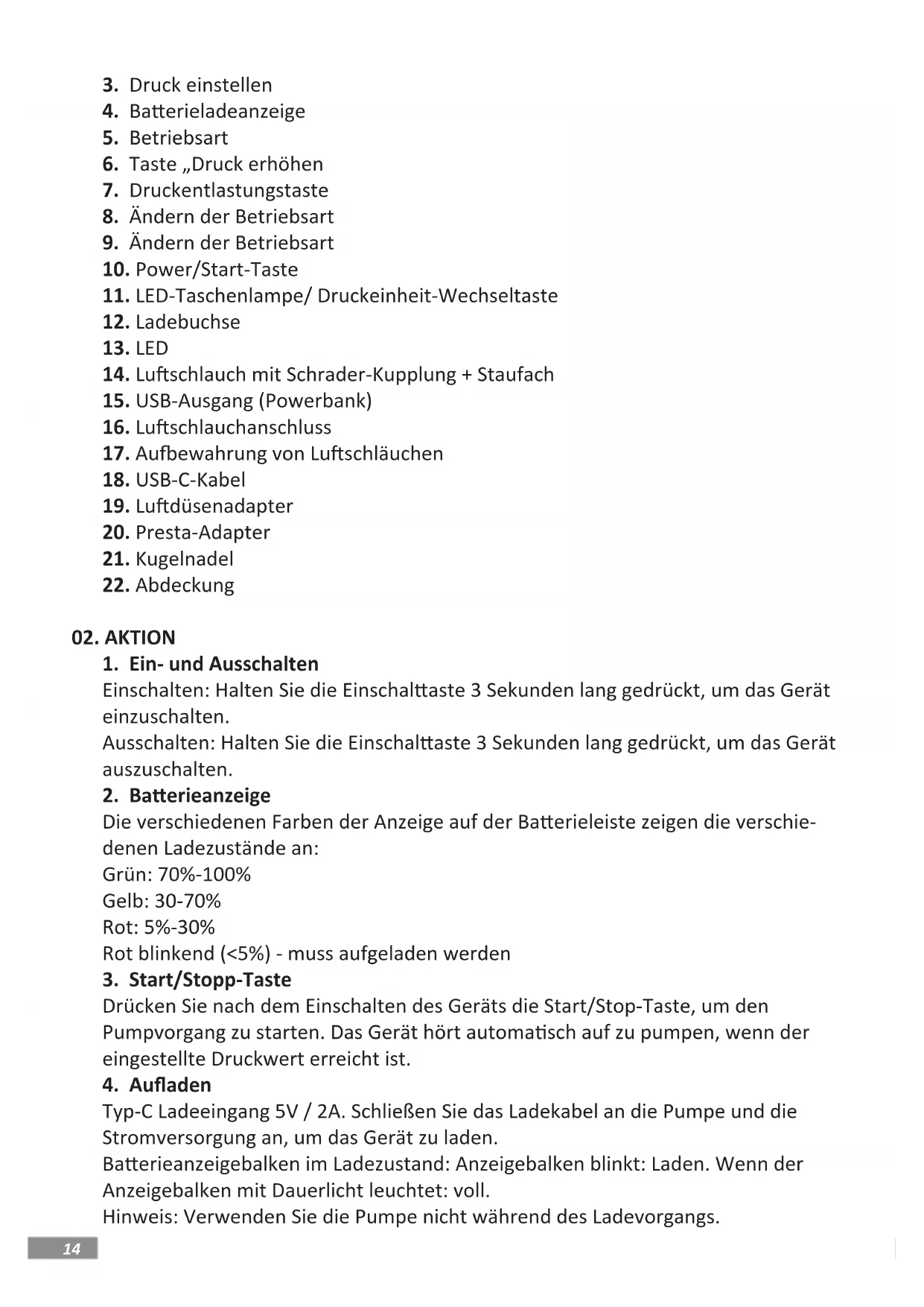 Typ-C Ladeeingang 5V / 2A. Schließen Sie das Ladekabel an die Pumpe und die Stromversorgung an, um das Gerät zu laden. Baerieanzeigebalken im Ladezustand: Anzeigebalken blinkt: Laden. Wenn der Anzeigebalken mit Dauerlicht leuchtet: voll. Hinweis: Verwenden Sie die Pumpe nicht während des Ladevorgangs.15