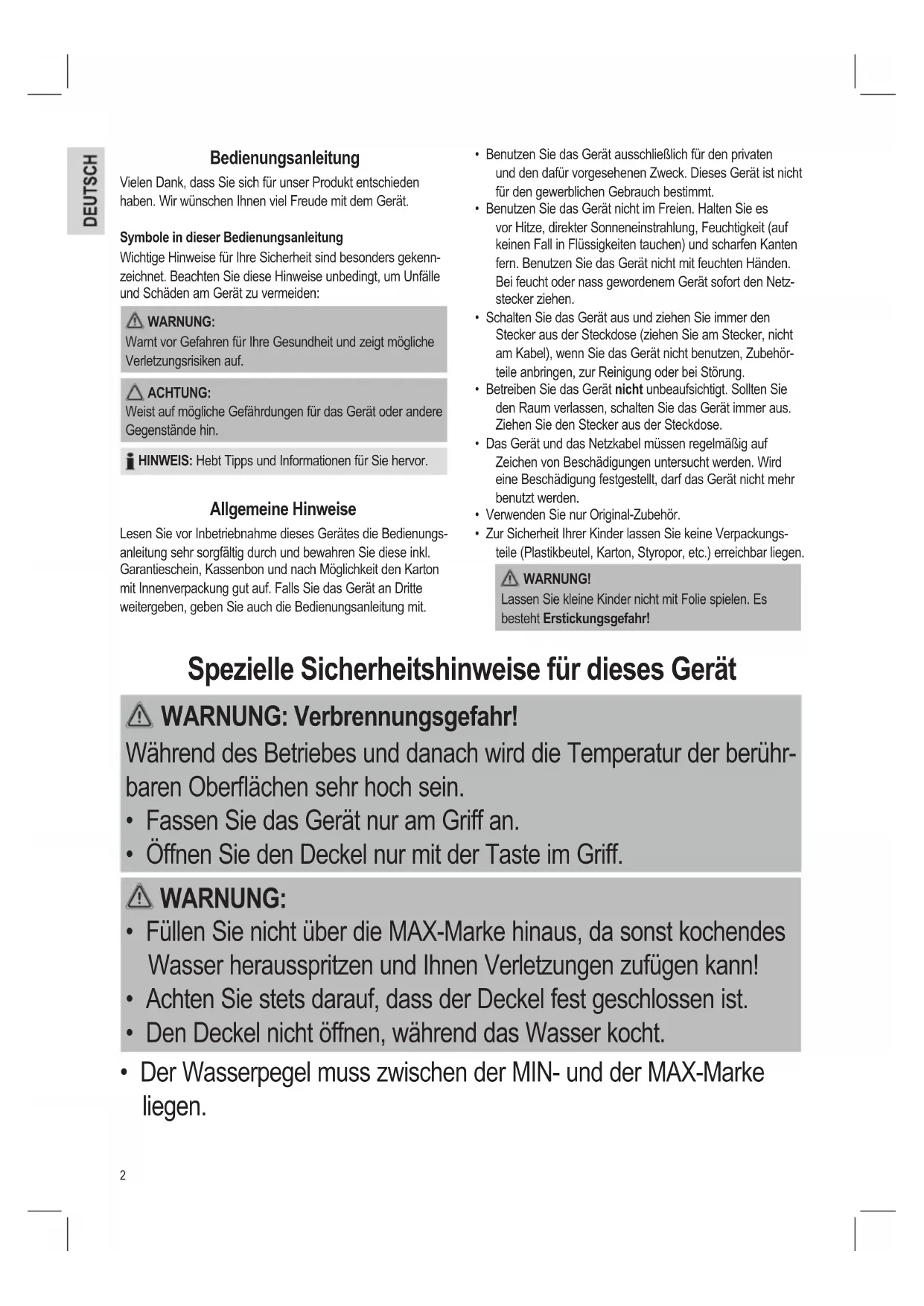- Dieses Gerät dient zum Erwärmen und Kochen von Trinkwasser. Verwenden Sie es niemals, um andere Flüssigkeiten oder Lebens- mittel aufzuwärmen.4