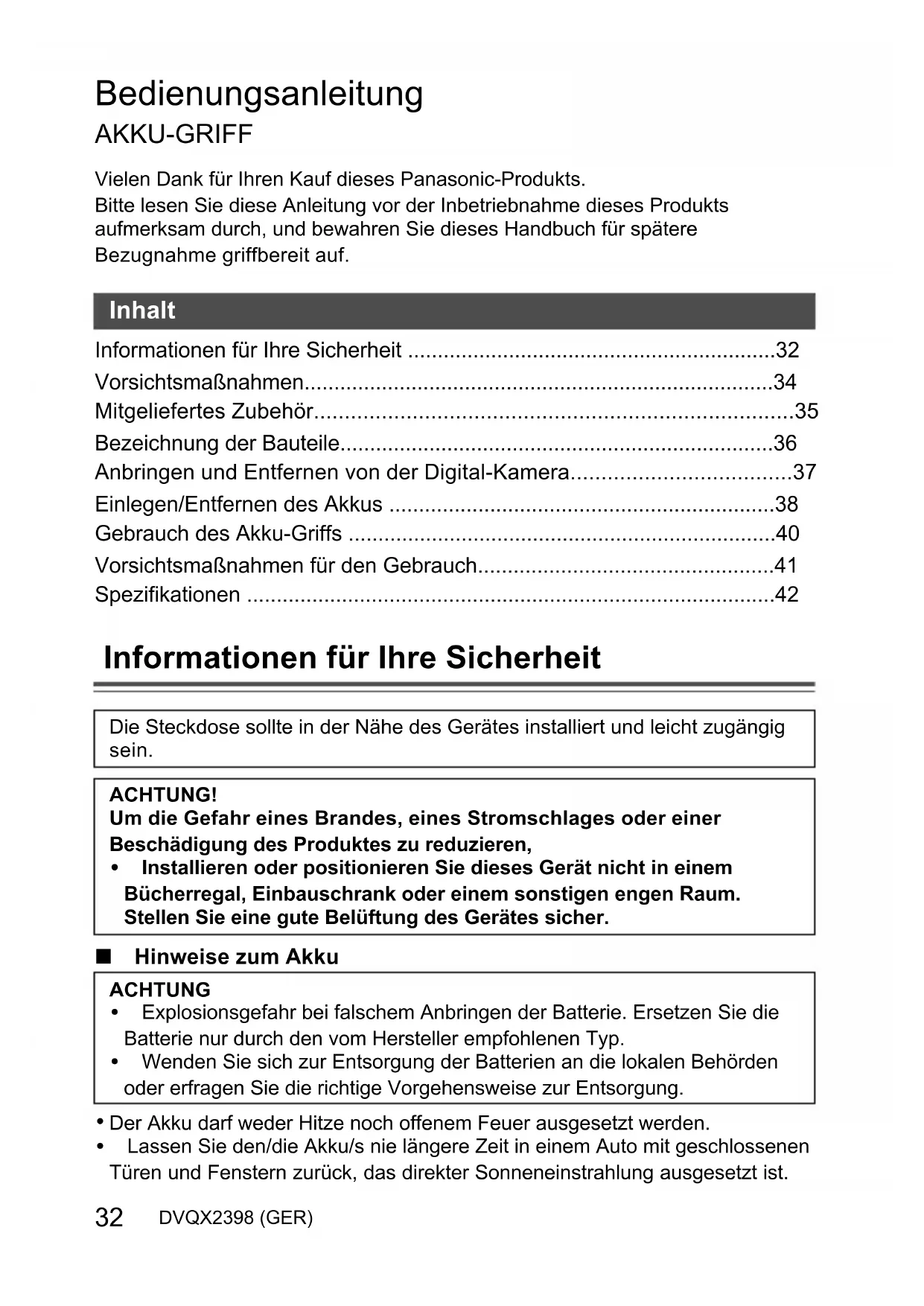 Der Akku darf weder Hitze noch offenem Feuer ausgesetzt werden. 0 Lassen Sie den/die Akku/s nie längere Zeit in einem Auto mit geschlossenen Türen und Fenstern zurück, das direkter Sonneneinstrahlung ausgesetzt ist. Inhalt Die Steckdose sollte in der Nähe des Gerätes installiert und leicht zugängig sein.ACHTUNG!Um die Gefahr eines Brandes, eines Stromschlages oder einer Beschädigung des Produktes zu reduzieren, 0 Installieren oder positionieren Sie dieses Gerät nicht in einem Bücherregal, Einbauschrank oder einem sonstigen engen Raum. Stellen Sie eine gute Belüftung des Gerätes sicher.ACHTUNG 0 Explosionsgefahr bei falschem Anbringen der Batterie. Ersetzen Sie die Batterie nur durch den vom Hersteller empfohlenen Typ. 0 Wenden Sie sich zur Entsorgung der Batterien an die lokalen Behörden oder erfragen Sie die richtige Vorgehensweise zur Entsorgung. DMW-BG1-DVQX2398.book 32 ページ 2023年8月24日 木曜日 午後3時18分33 (GER) DVQX2398 DEUTSCH 0 Nicht in großen Höhen einem niedrigen Luftdruck aussetzen. 0 Nicht extrem niedrigem Luftdruck aussetzen, da dies zu Explosionen oder dem Austreten von brennbaren Flüssigkeiten und Gasen führen kann. -Bedeutung des nachstehend abgebildeten Symbols- Warnung Brand-, Explosions- und Verbrennungsgefahr. Nicht auseinandernehmen, über 60 oC erhitzen oder anzünden. Entsorgung von Altgeräten und Batterien Nur für die Europäische Union und Länder mit Recyclingsystemen Dieses Symbol auf den Produkten, der Verpackung und/oder den Begleitdokumenten bedeutet, dass gebrauchte elektrische und elektronische Produkte sowie Batterien nicht in den allgemeinen Hausmüll gegeben werden dürfen. Bitte führen Sie alte Produkte und verbrauchte Batterien zur Behandlung, Aufarbeitung bzw. zum Recycling gemäß den gesetzlichen Bestimmungen den zuständigen Sammelpunkten zu. Zusätzlich ist die Rückgabe unter bestimmten Voraussetzungen auch bei Vertreibern (Verkaufsfläche für Elektro- und Elektronikgeräte von mindestens 400 m² und Lebensmitteleinzelhändler, die über eine Gesamtverkaufsfläche von mindestens 800 m² verfügen und mehrmals im Kalenderjahr oder dauerhaft auch Elektro- und Elektronikgeräte anbieten und auf dem Markt bereitstellen) möglich. Die Rücknahme hat kostenlos beim Kauf eines gleichartigen Neugerätes zu erfolgen (1:1 Rücknahme). Unabhängig davon, gibt es die Möglichkeit, die Altgeräte kostenlos an den Vertreiber zurückzugeben (0:1 Rücknahme; Abmessungen kleiner als 25 cm und weniger als drei Altgeräte). Vertreiber, die unter Verwendung von Fernkommunikationsmitteln ihre Produkte verkaufen, sind zur Rücknahme von Altgeräten verpflichtet, wenn die Lager- und Versandflächen für Elektro- und Elektronikgeräte mindestens 400 m² betragen. Onlineverzeichnis der Sammel- und Rücknahmestellen: https://www.ear-system.de/ear-verzeichnis/sammel-und-ruecknahmestellen. Enthalten die Produkte Batterien und Akkus oder Lampen, die aus dem Altgerät zerstörungsfrei entnommen werden können, sind Sie als Endnutzer gesetzlich dazu verpflichtet, diese vor der Entsorgung zu entnehmen und getrennt als Batterie bzw. Lampe zu entsorgen. Batterien können zusätzlich im Handelsgeschäft unentgeltlich zurückgegeben werden. Indem Sie diese Produkte und Batterien ordnungsgemäß entsorgen, helfen Sie dabei, wertvolle Ressourcen zu schützen und eventuelle negative Auswirkungen, insbesondere beim Umgang mit lithiumhaltigen Batterien, auf die menschliche Gesundheit und die Umwelt zu vermeiden. Für mehr Informationen zu Sammlung und Recycling, wenden Sie sich bitte an Ihren örtlichen Abfallentsorgungsdienstleister. Gemäß Landesvorschriften können wegen nicht ordnungsgemäßer Entsorgung dieses Abfalls Strafgelder verhängt werden. Datenschutz Wir weisen alle Endnutzer von Elektro- und Elektronikaltgeräten darauf hin, dass Sie für das Löschen personenbezogener Daten auf den zu entsorgenden Altgeräten selbst verantwortlich sind. Hinweis für das Batteriesymbol (Symbol unten): Dieses Symbol kann in Kombination mit einem chemischen Symbol abgebildet sein. In diesem Fall erfolgt dieses auf Grund der Anforderungen derjenigen Richtlinien, die für die betreffende Chemikalie erlassen wurden. DMW-BG1-DVQX2398.book 33 ページ 2023年8月24日 木曜日 午後3時18分34 DVQX2398 (GER) Vorsichtsmaßnahmen