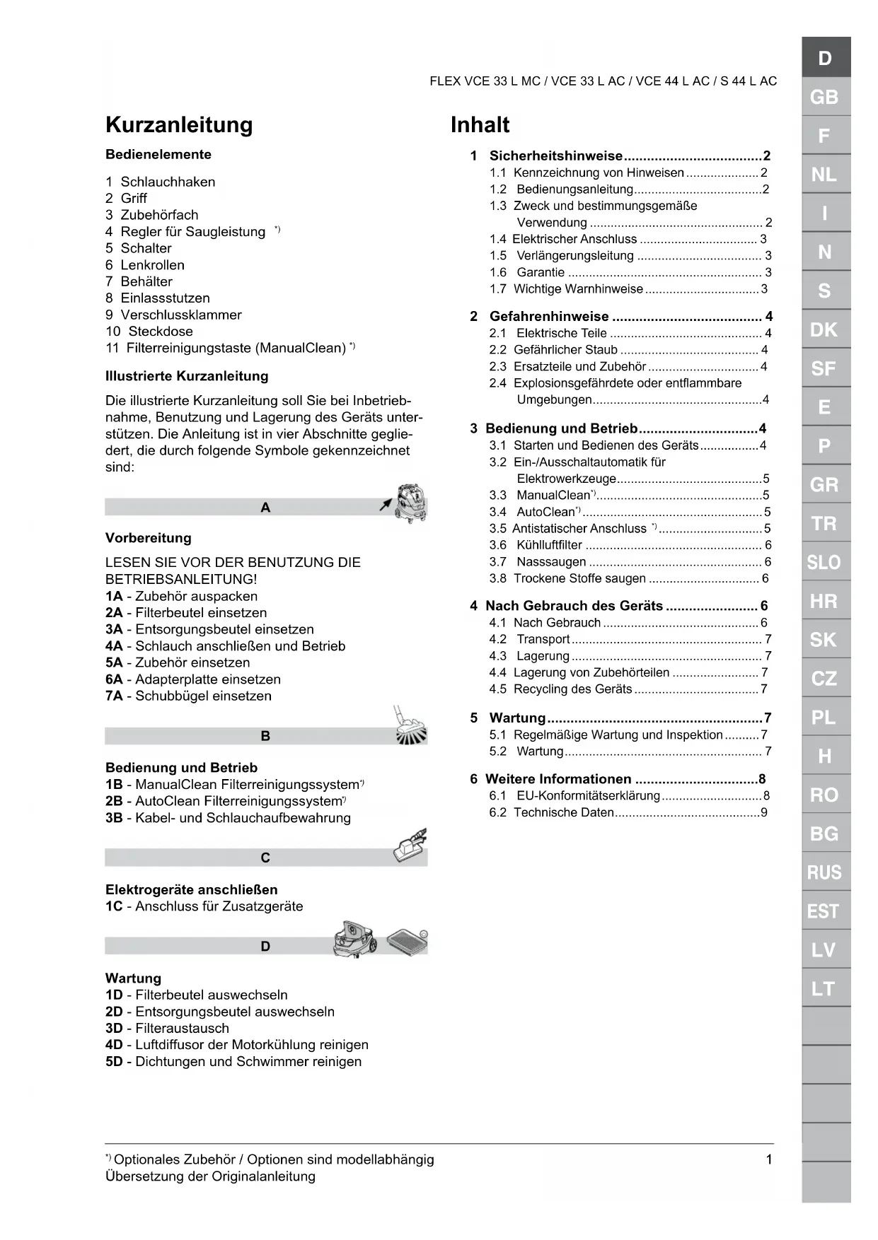 FLEX VCE 33 L MC / VCE 33 L AC / VCE 44 L AC / S 44 L AC Bitte beachten Sie vor Inbetriebnahme die in Ihrem Land gültigen Vorschriften.