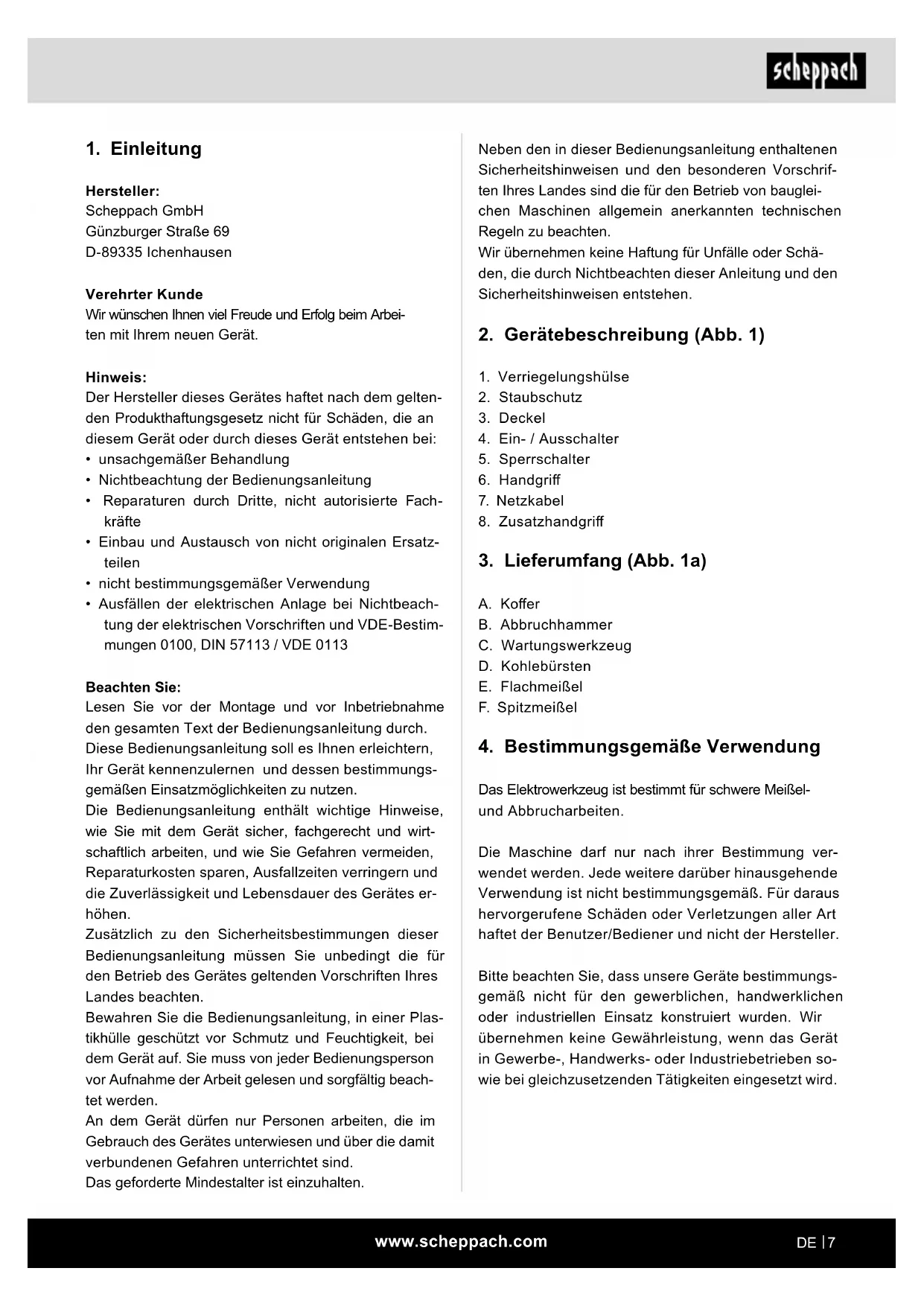 Das Elektrowerkzeug ist bestimmt für schwere Meißel- und Abbrucharbeiten. Die Maschine darf nur nach ihrer Bestimmung ver- wendet werden. Jede weitere darüber hinausgehende Verwendung ist nicht bestimmungsgemäß. Für daraus hervorgerufene Schäden oder Verletzungen aller Art haftet der Benutzer/Bediener und nicht der Hersteller. Bitte beachten Sie, dass unsere Geräte bestimmungs- gemäß nicht für den gewerblichen, handwerklichen oder industriellen Einsatz konstruiert wurden. Wir übernehmen keine Gewährleistung, wenn das Gerät in Gewerbe-, Handwerks- oder Industriebetrieben so- wie bei gleichzusetzenden Tätigkeiten eingesetzt wird.www.scheppach.com