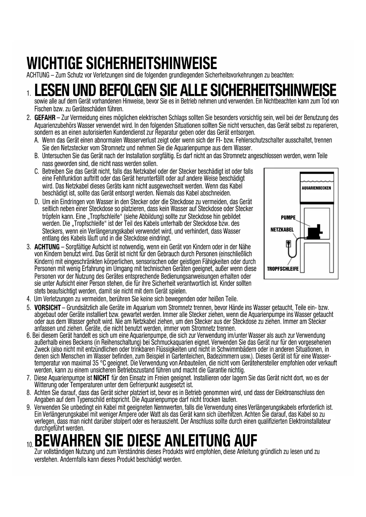 - VORSICHT – Grundsätzlich alle Geräte im Aquarium vom Stromnetz trennen, bevor Hände ins Wasser getaucht, Teile ein- bzw. abgebaut oder Geräte installiert bzw. gewartet werden. Immer alle Stecker ziehen, wenn die Aquarienpumpe ins Wasser getaucht oder aus dem Wasser geholt wird. Nie am Netzkabel ziehen, um den Stecker aus der Steckdose zu ziehen. Immer am Stecker anfassen und ziehen. Geräte, die nicht benutzt werden, immer vom Stromnetz trennen.