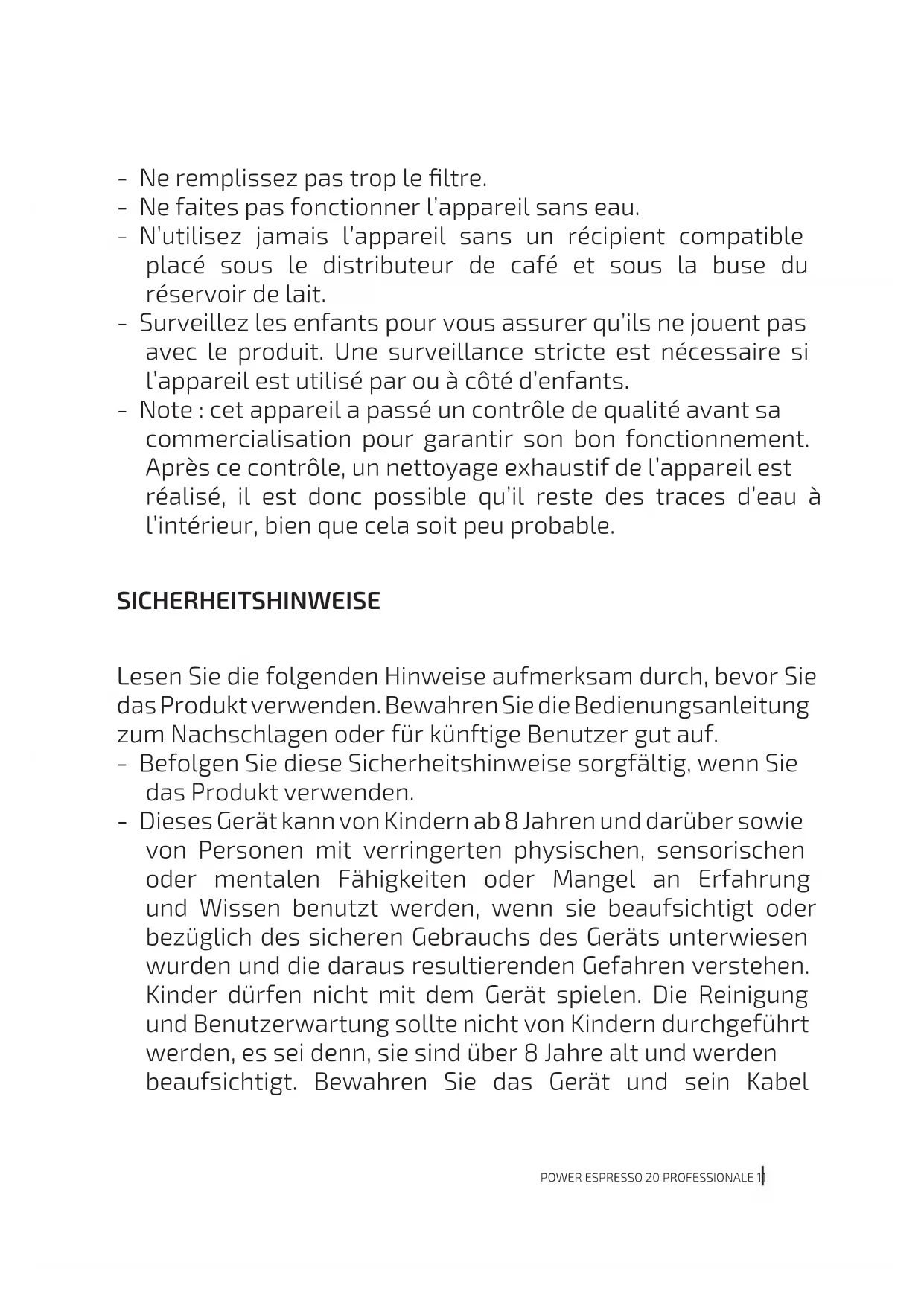 Veuillez lire les instructions suivantes avec attention avant d’utiliser l’appareil. Gardez bien ce manuel pour de futures références ou pour tout nouvel utilisateur. - Veuillez suivre ces instructions de sécurité très attentivementPOWER ESPRESSO 20 PROFESSIONALE 9 lorsque vous utilisez l’appareil. - Cet appareil peut être utilisé par des enfants de 8 ans et plus et par des personnes aux capacités physiques, mentales ou sensorielles réduites, ou sans expérience ni connaissances s’ils sont surveillés et/ou ont reçu les informations nécessaires à l’utilisation correcte de l’appareil et qu’ils ont bien compris les risques qu’il implique. Empêchez les enfants de jouer avec le produit. Le nettoyage et l’entretien à réaliser par l’utilisateur ne doivent pas être eectués par des enfants, sauf s’ils sont âgés de plus de 8 ans et sous surveillance. Maintenez l’appareil et son câble hors de portée des enfants de moins de 8 ans. - Inspectez le câble d’alimentation régulièrement pour rechercher des dommages visibles. Si le câble d’alimentation est endommagé, il doit être substitué par le fabricant, par le Service Après-Vente ou par du personnel qualié pour éviter des dangers. - Cette icône signie : attention ! Surface chaude. Les surfaces accessibles peuvent atteindre de températures élevées pendant l’utilisation. - Cet appareil est conçu pour un usage domestique uniquement et ne doit pas être utilisé dans les bars, restaurants, fermes, hôtels, motels et bureaux. - AVERTISSEMENT : l’ouverture de remplissage ne doit pas être ouverte pendant l’utilisation. - Avertissement : faites attention à ne pas renverser de liquides sur le conducteur d’électricité. - AVERTISSEMENT: une utilisation incorrecte ou inadéquate peut mettre en danger l’appareil et l’utilisateur. Utilisez cet appareil uniquement pour les ns décrites dans ce manuel. La surface de l’élément chauant est soumise à une chaleur résiduelle après utilisation.POWER ESPRESSO 20 PROFESSIONALE10 - Assurez-vous que le voltage du réseau coïncide avec le voltage spécié sur l’étiquette de classication de l’appareil et que la prise possède une connexion à terre. - Ne submergez pas le câble, la prise ni aucune autre partie de l’appareil dans de l’eau ni dans aucun autre liquide, ni n’exposez les connexions électriques à l’eau. Assurez-vous d’avoir les mains complètement sèches avant de toucher la prise ou d’allumer l’appareil. - Ne tordez pas, ne pliez pas, n’étirez pas et n’abîmez pas le câble d’alimentation. Protégez-le des bords pointus et des sources de chaleur. Ne laissez pas le câble toucher des surfaces chaudes ni dépasser de la surface de travail ou du plan de travail. - Éteignez et débranchez l’appareil de la source d’alimentation lorsque vous avez ni de l’utiliser et avant de le nettoyer. Tirez sur la che pour le débrancher ; ne tirez pas sur le câble. - Placez l’appareil sur une surface sèche, stable, plate et résistante à la chaleur. - N’utilisez pas l’appareil dans les circonstances suivantes : - dans ou sur des cuisines électriques ou à gaz, dans des fours chauds ni près du feu; - sur des surfaces molles (comme les tapis) ou des surfaces desquelles l’appareil pourrait se renverser pendant utilisation; - en extérieurs ou dans des endroits possédant des niveaux d’humidité élevés. - Ne nettoyez pas l’appareil dans le lave-vaisselle. - Maintenez une distance de sécurité minimale de 20 cm de chaque côté et de 30 cm au-dessus du produit lorsqu’il est en fonctionnement. - Ne placez pas le produit sous des armoires ou meubles de cuisine, le produit émet de la vapeur et pourrait les abîmer.POWER ESPRESSO 20 PROFESSIONALE 11 - Ne remplissez pas trop le ltre. - Ne faites pas fonctionner l’appareil sans eau. - N’utilisez jamais l’appareil sans un récipient compatible placé sous le distributeur de café et sous la buse du réservoir de lait. - Surveillez les enfants pour vous assurer qu’ils ne jouent pas avec le produit. Une surveillance stricte est nécessaire si l’appareil est utilisé par ou à côté d’enfants. - Note : cet appareil a passé un contrôle de qualité avant sa commercialisation pour garantir son bon fonctionnement. Après ce contrôle, un nettoyage exhaustif de l’appareil est réalisé, il est donc possible qu’il reste des traces d’eau à l’intérieur, bien que cela soit peu probable. SICHERHEITSHINWEISE Lesen Sie die folgenden Hinweise aufmerksam durch, bevor Sie das Produkt verwenden. Bewahren Sie die Bedienungsanleitung zum Nachschlagen oder für künftige Benutzer gut auf. - Befolgen Sie diese Sicherheitshinweise sorgfältig, wenn Sie das Produkt verwenden. - Dieses Gerät kann von Kindern ab 8 Jahren und darüber sowie von Personen mit verringerten physischen, sensorischen oder mentalen Fähigkeiten oder Mangel an Erfahrung und Wissen benutzt werden, wenn sie beaufsichtigt oder bezüglich des sicheren Gebrauchs des Geräts unterwiesen wurden und die daraus resultierenden Gefahren verstehen. Kinder dürfen nicht mit dem Gerät spielen. Die Reinigung und Benutzerwartung sollte nicht von Kindern durchgeführt werden, es sei denn, sie sind über 8 Jahre alt und werden beaufsichtigt. Bewahren Sie das Gerät und sein KabelPOWER ESPRESSO 20 PROFESSIONALE12 außerhalb der Reichweite von Kindern unter 8 Jahren auf. - Überprüfen Sie das Netzkabel regelmäßig auf sichtbare Schäden. Wenn das Netzkabel beschädigt ist, muss es durch den Hersteller, den Kundenservice oder qualiziertes Personal ersetzt werden, um Schäden zu vermeiden. - Dieses Symbol bedeutet: Vorsicht, heiße Oberäche. Zugängliche Flächen können sich bei der Benutzung erwärmen. - Dieses Gerät ist nur für den Hausgebrauch bestimmt und darf nicht in Bars, Restaurants, Bauernhöfen, Hotels, Motels und Büros verwendet werden. - ACHTUNG: Die Einfüllönung darf während des 