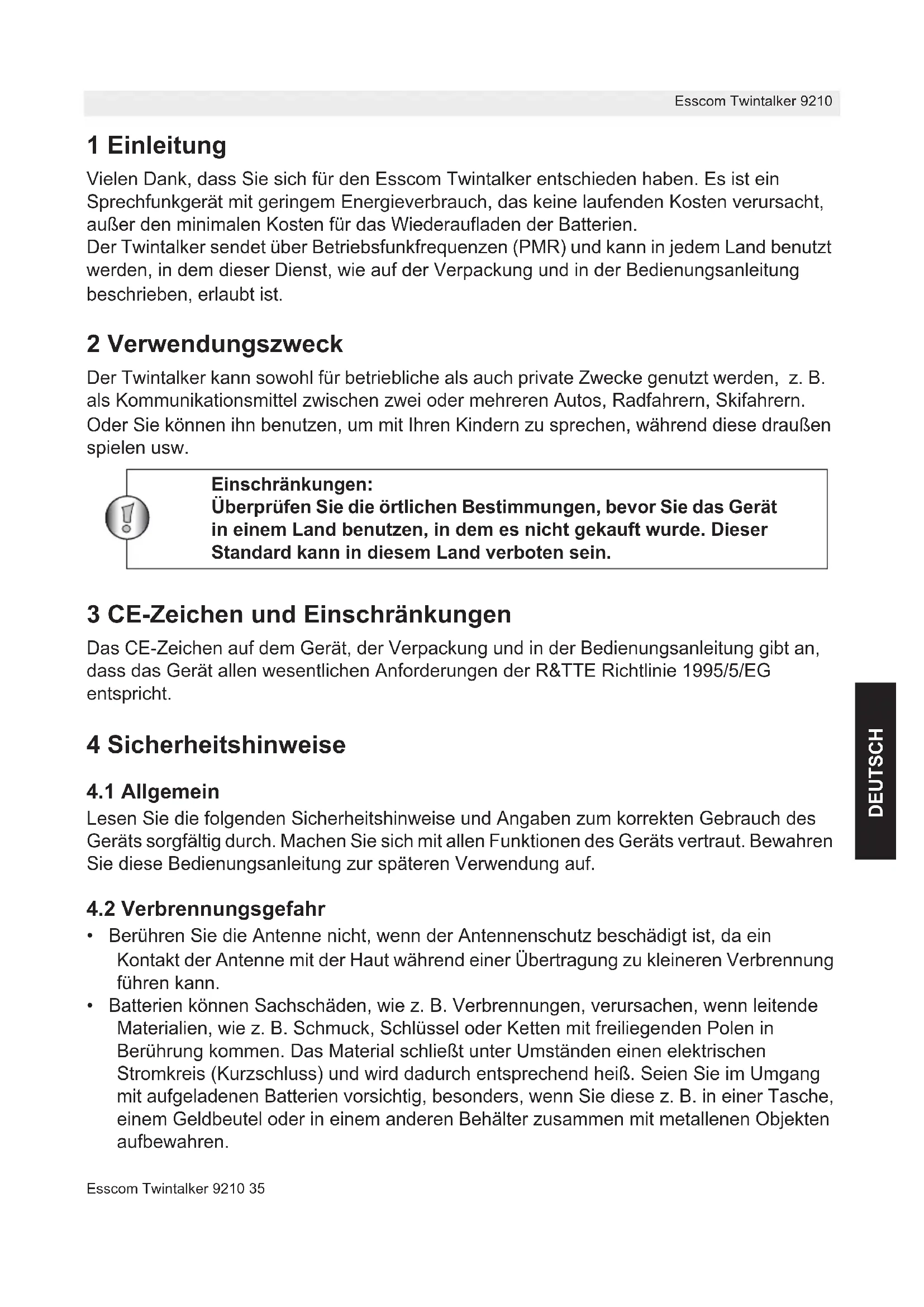 Vielen Dank, dass Sie sich für den Esscom Twintalker entschieden haben. Es ist ein Sprechfunkgerät mit geringem Energieverbrauch, das keine laufenden Kosten verursacht, außer den minimalen Kosten für das Wiederaufladen der Batterien.