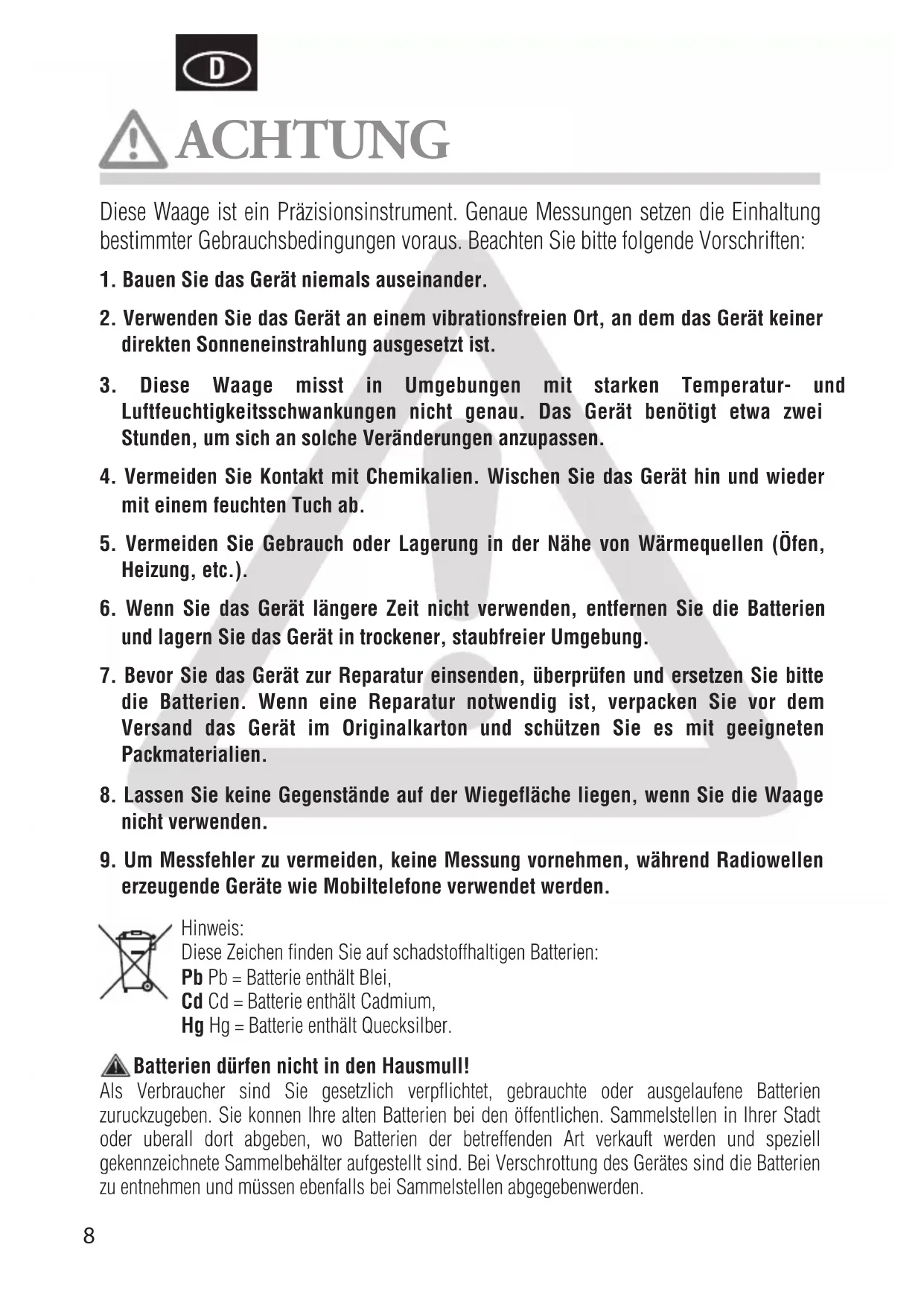 These Waage ist ein Präzisionsinstrument. Genaue Messungen setzen die Einhaltung bestimmter Gebrauchsbedingungen voraus. Beachten Sieitte folgende Vorschriften: